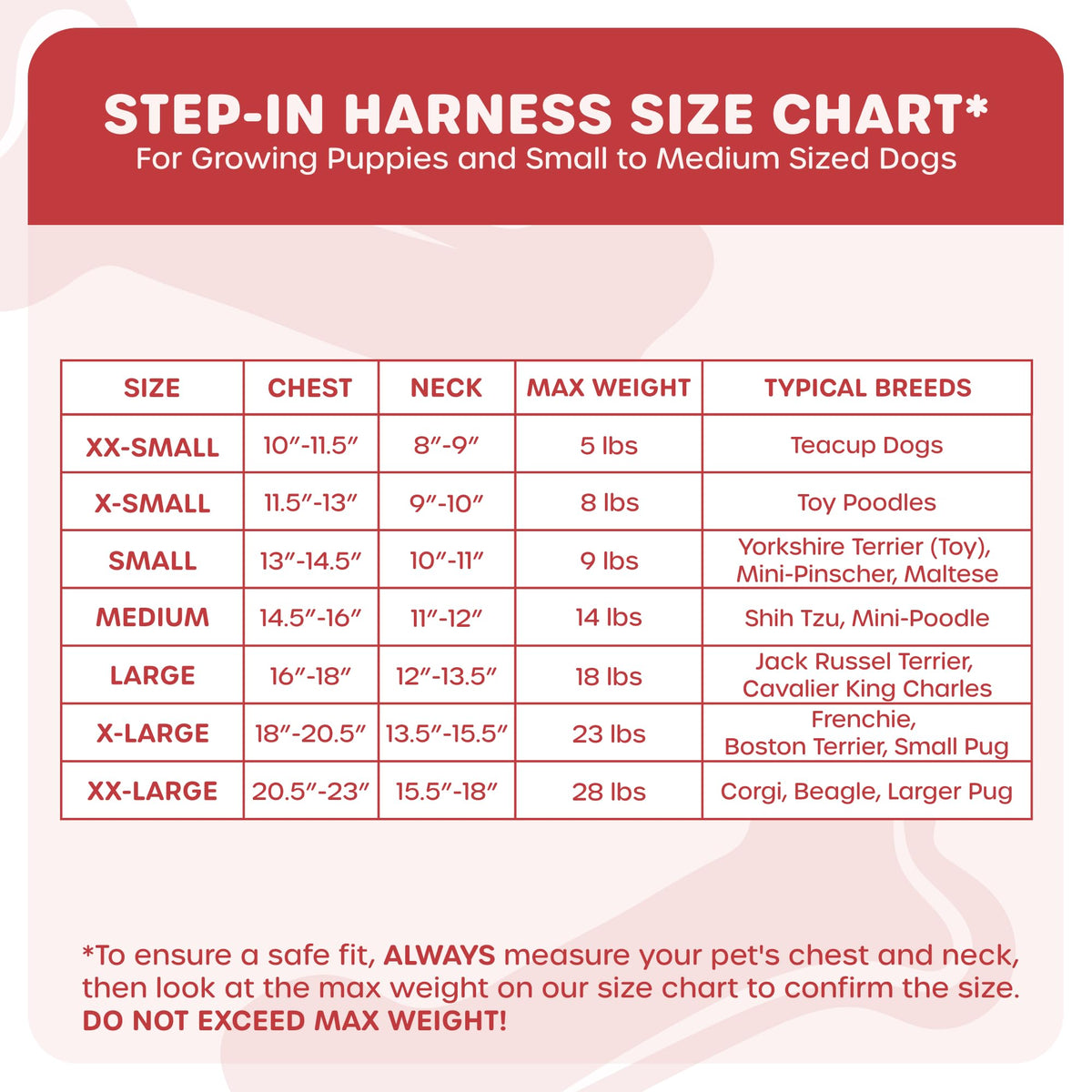 FeaturesTriple Security: hook and loop closure, quality buckle clip and double D-rings for secure leash attachment. Adjustable design fits better than traditional harnesses!Breathable mesh that keeps your dog comfortable and is perfect for all types of weatherAvailable in an array of colors and sizes ensuring you find the perfect fitHASSLE FREE GUARANTEE! Free exchanges if it doesnt fit your dog. BUY WITH PEACE OF MIND TODAY!Size ChartX-Small: Fits 12 - 13 chest, 8 neckSmall: Fits 14 - 16 chest, 9.5 neckMedium: Fits 16 - 18 chest, 11 neckLarge: Fits 18 - 21 chest, 13 neck