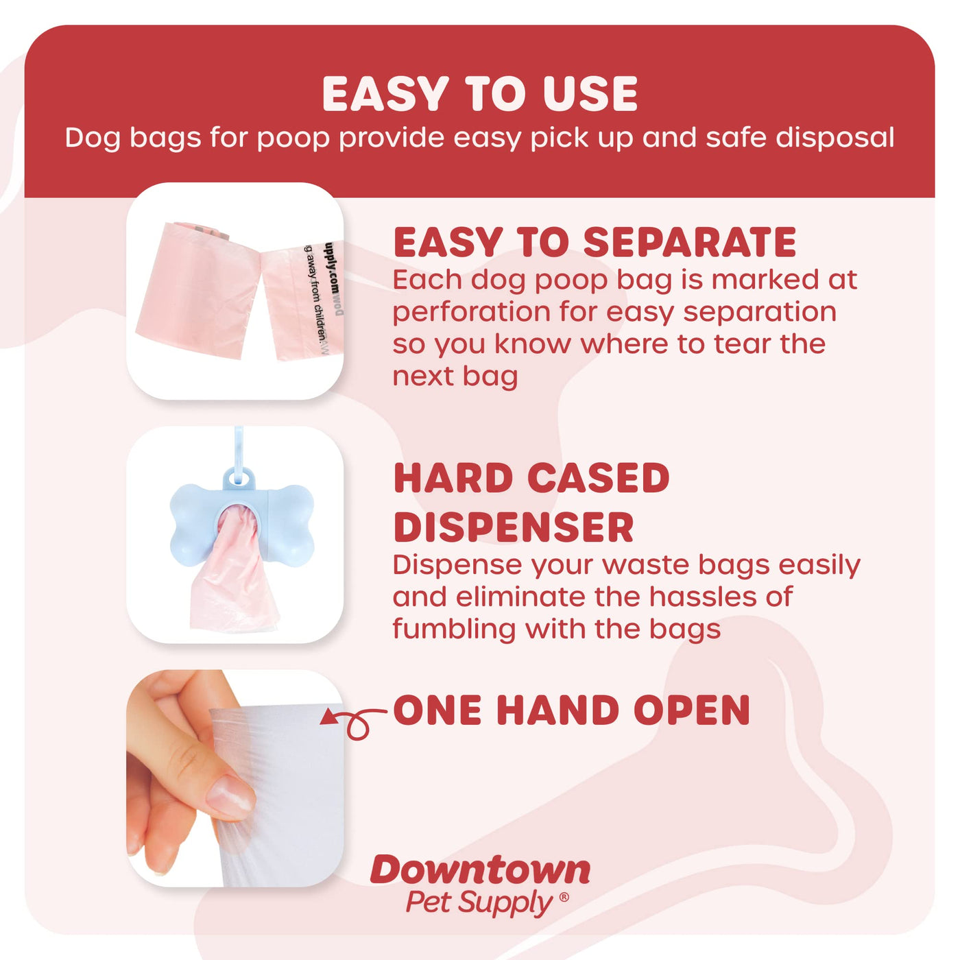 Q: Is the dispenser easy to use and refill?A: Yes, the included bone-shaped dispenser is designed for easy use and refilling. Simply twist off the cap, insert a new roll of bags, and securely attach it to your leash, belt, or bag for convenient access.
