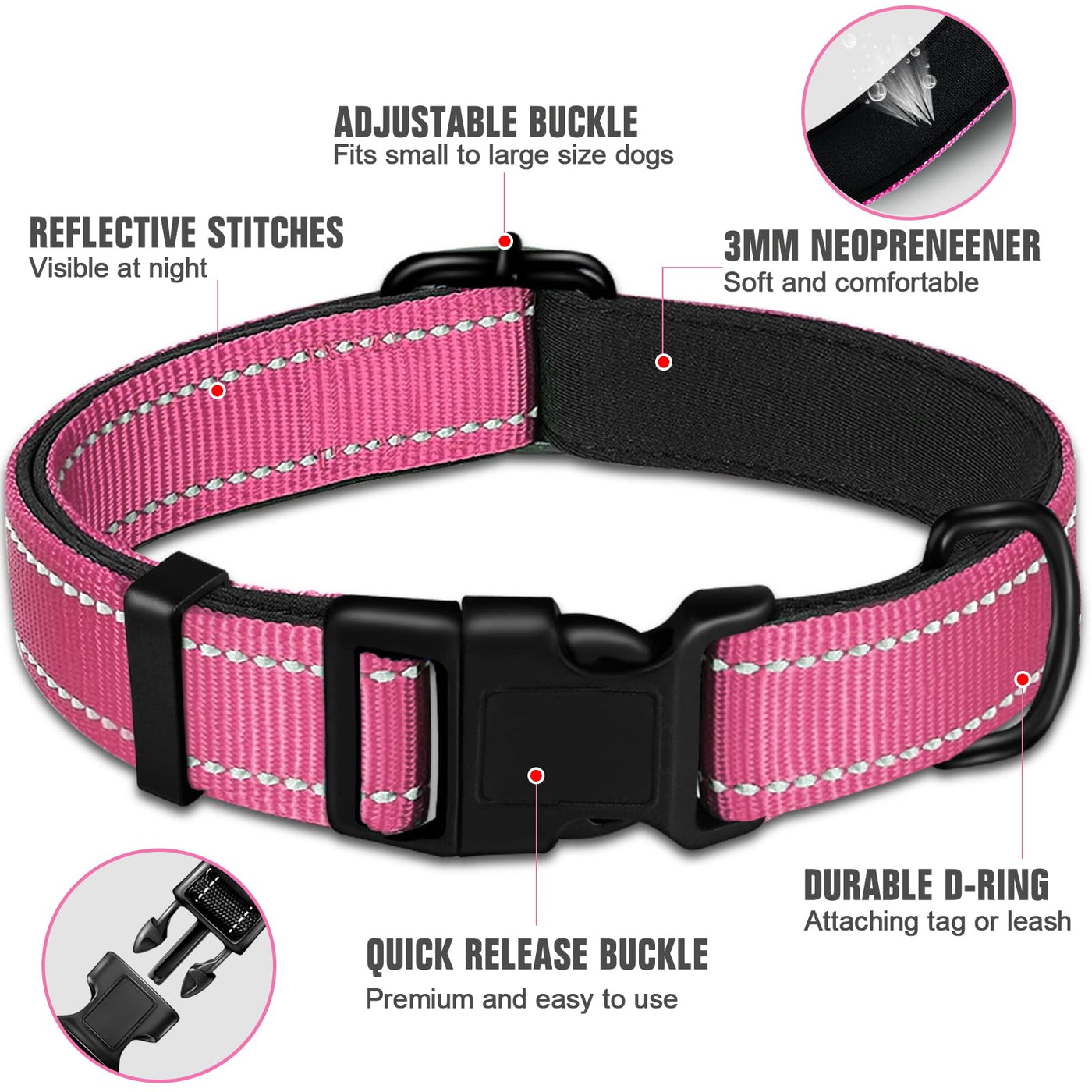 COMFORTABLE PADDED COLLAR - Unlike ordinary regular collars we hope to bring a comfortable experience for your pet.For protecting dog 's neck our collar is added PADDED NEOPRENE rubber material lining a kind of material that fast dries flexible and ultra soft.Even if it is worn for a long time or pulled hard it will not hurt or scratch the neck.