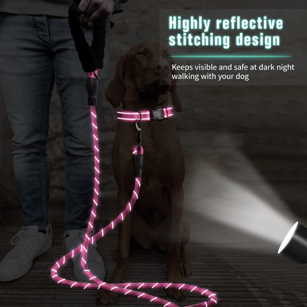 Q: Are the collar and leash reflective for night visibility?A: Yes, both the collar and leash are made with highly reflective threads to ensure high visibility at night, enhancing safety during evening walks.