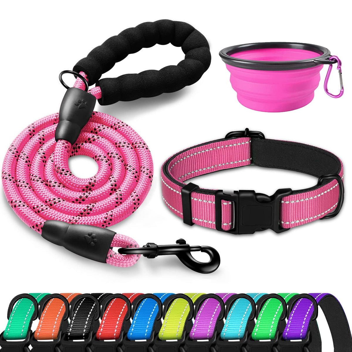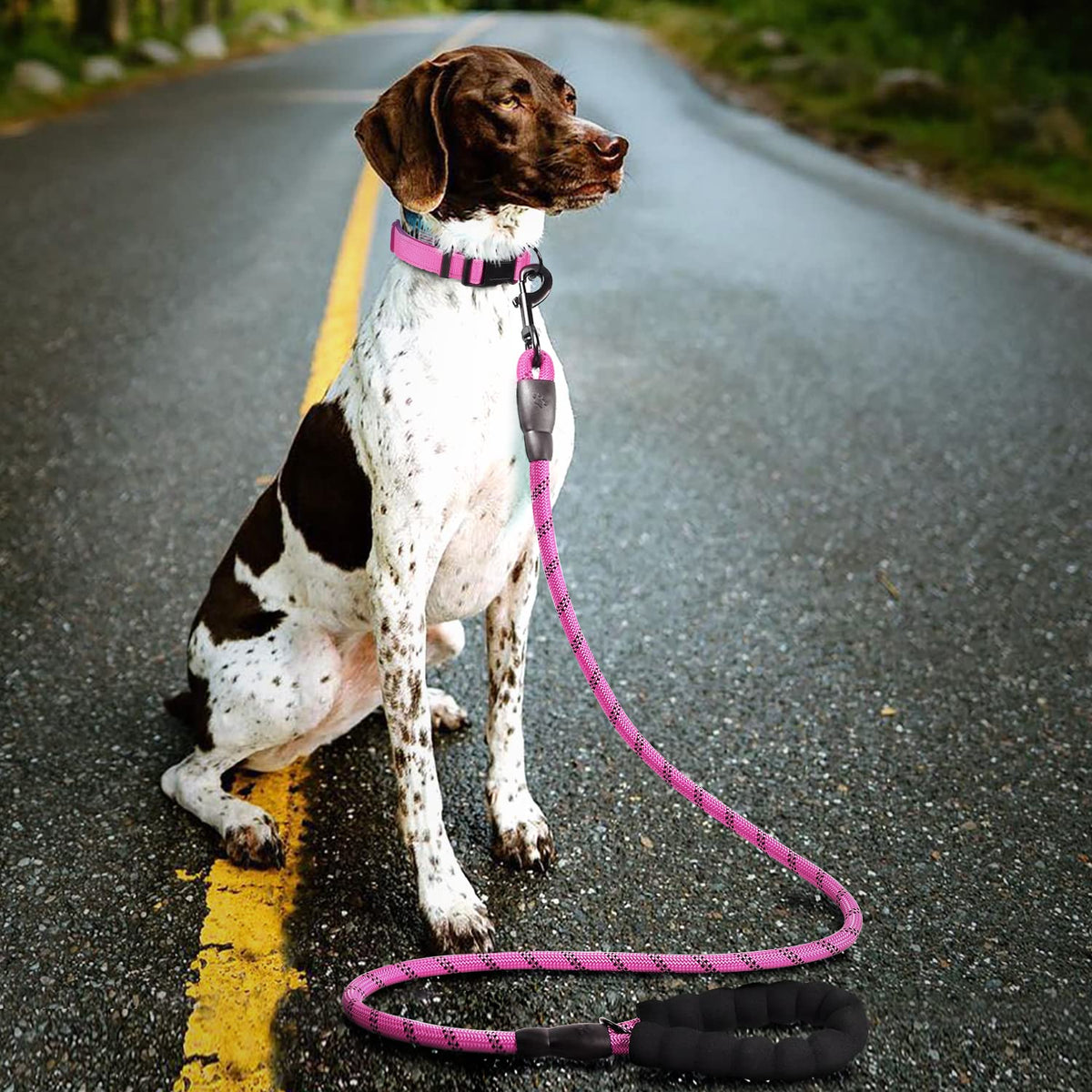 LEASH AND COLLAR SET - Get our convenient leash and collar set.This nylon dog collar is a classic yet stylish collar that comes in 6 colors and 4 sizes so you can find just the right one for your dog.Each collar include a free 5ft dog leash. Save your time! No longer need to take time to pick a leash.