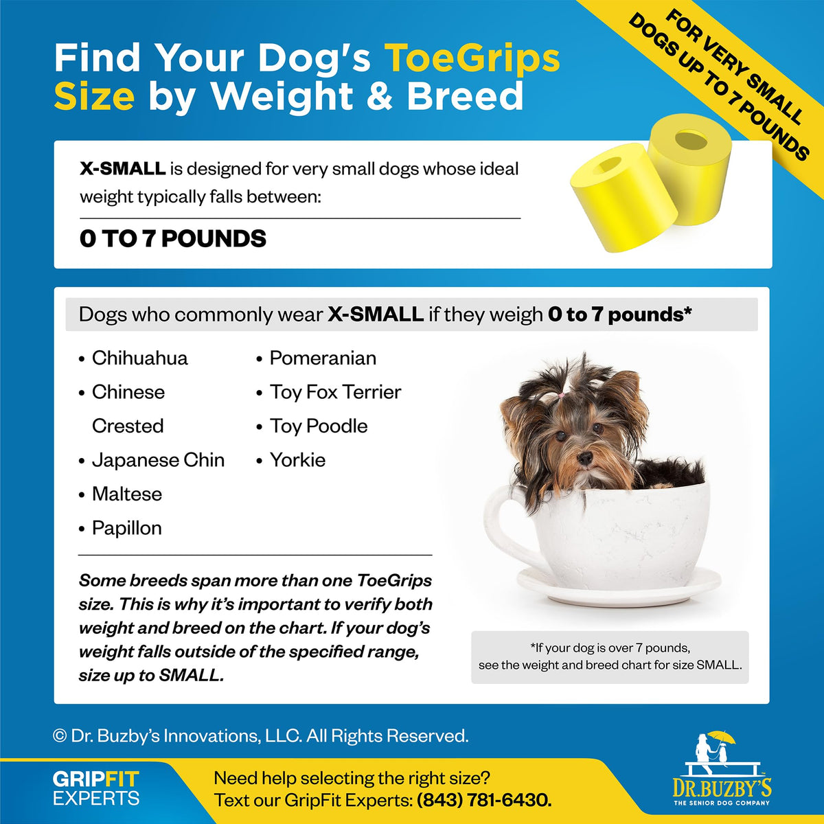 Q: Are ToeGrips suitable for all dog sizes?A: Yes, Dr Buzby's ToeGrips are designed for dogs of all shapes and sizes. The XSmall size is specifically tailored for smaller breeds, ensuring a secure fit that allows for maximum traction and comfort.