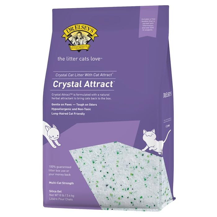 Q: What makes Dr. Elsey's Crystal Attract Silica Cat Litter different from other litters?A: Dr. Elsey's Crystal Attract Silica Cat Litter is unique due to its silica gel composition infused with hydrolyzed herbs that attract cats to the litter box, making it ideal for long-haired cats. The particle size is specifically designed to prevent sticking to your cat's coat.