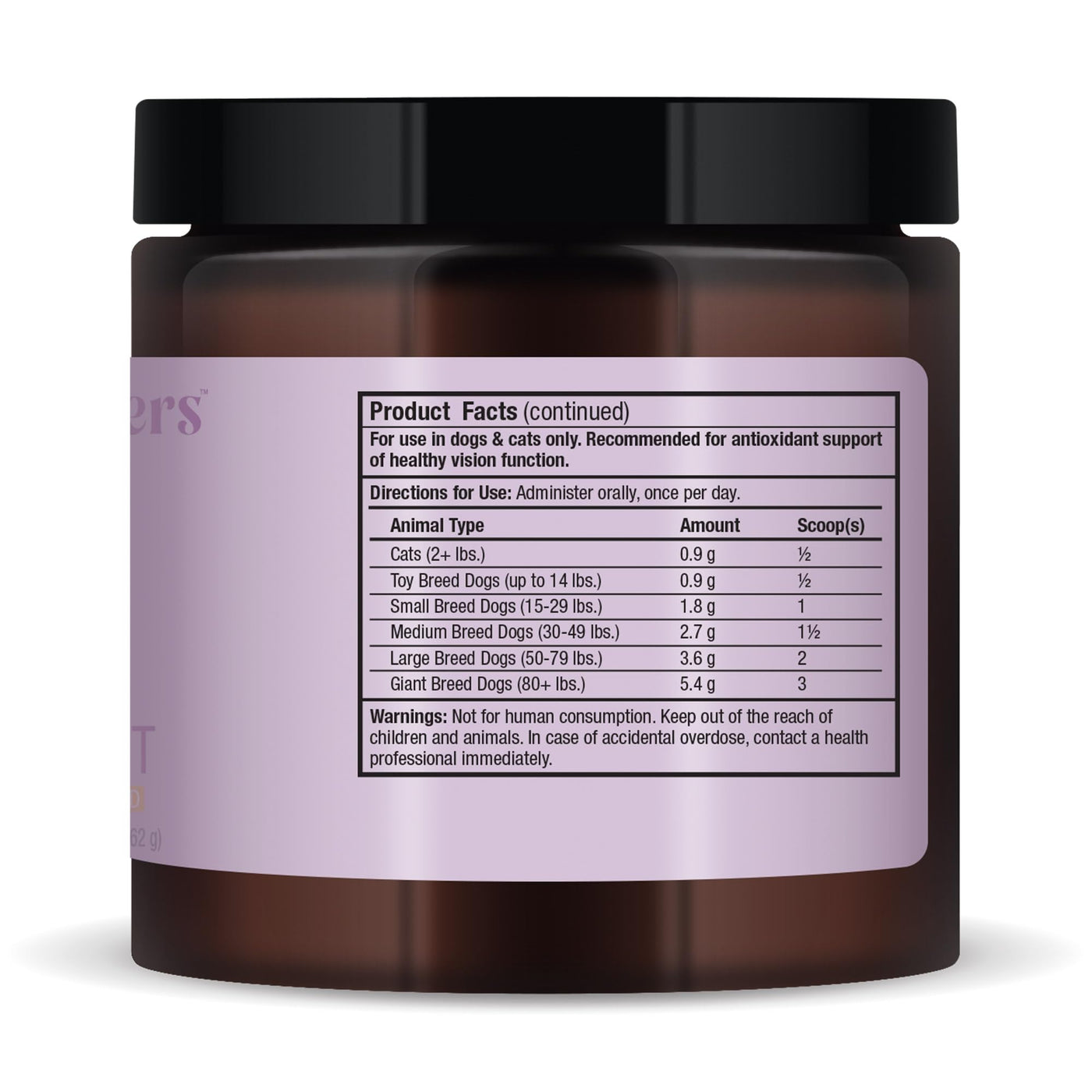 As your pets age, changes occur in their eye health, just as with humans. One change that many pet owners notice is a clouding of the lens. Your pets eyes may also become more light-sensitive as they age.A healthy diet complete with natural antioxidants is important in helping to support your pets eye health and vision - Dr Mercola Eye Support for Pets compliments your pets diet with a boost of these important antioxidants!Dr Mercola Eye Support for Pets is a blend designed especially for dog and cat eye health and contains Bilberry Fruit, Lutein, Astaxanthin, Zeaxanthin, Vitamin C and Vitamin E.Here are some features that make Dr Mercola Eye Support for Pets different than other pet health supplements: Eye Support for Pets contains some of the top eye health-supporting antioxidants: lutein, astaxanthin, zeaxanthin, and vitamins C and E The astaxanthin in Eye Support for Pets comes from green algae, one of the most bioavailable natural sources of astaxanthin, rather than synthetic sources. It is also made with a special non-toxic CO2 extraction method that yields a pure, top-quality product with 10% astaxanthin, compared to a typical 5-7% yield for other products The zeaxanthin is sourced from marigold flowers rather than a synthetic source The bilberry is sourced from bilberry fruit Dr Mercola Eye Support for Pets comes in a pet-friendly natural liver-flavor powdered form Dr Mercola Eye Support for Pets is a room-temperature stable product with a long shelf lifeAntioxidants like those in Eye Support for Pets can help neutralize oxidizing free radicals, thus potentially helping improve your pets metabolic functions, eye tissue health, and prevent premature aging.You want the best for protecting and improving your pets health - give them a boost of helpful antioxidants with Dr Mercola Eye Support for Pets! Order yours today!