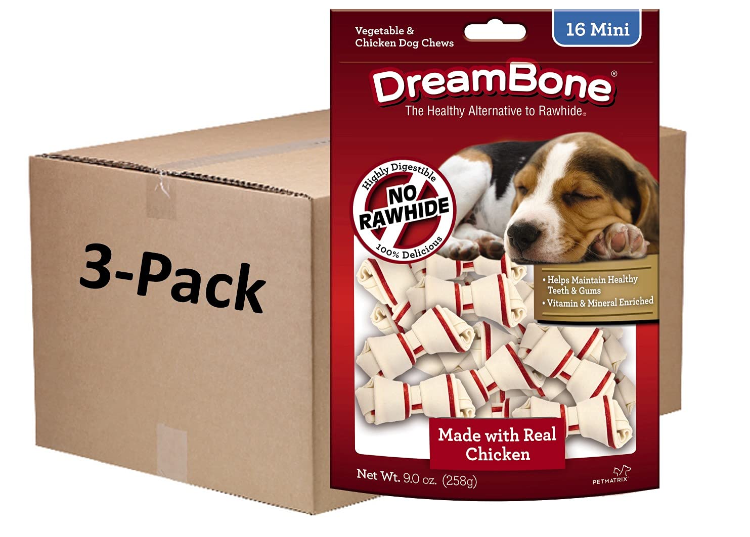 DreamBone chews have all the benefits of a rawhide chewwithout the rawhide. No-rawhide DreamBone chews are made with real chicken, beef, bacon and cheese or sweet potato and wholesome vegetables for a scrumptious taste dogs cant resist! No-rawhide DreamBone Mini Chews for dogs are made with real chicken and wholesome vegetables for an irresistible taste dogs dream about. Enriched with vitamins and minerals, these chews are a healthy alternative to rawhide. Treat your small or toy-sized pup to these highly digestible and 100 percent delicious mini chews. DreamBone Mini Chews promote healthy teeth and gums through the natural action of chewing, making them a treat both you and your dog can love. Give your dog 1 to 2 DreamBone Mini Chews per day. Always supervise your pup during chewing activity and provide access to fresh, clean water. These chews are intended for intermittent or supplemental feeding only. Store in a cool, dry place. After opening, reseal or store in an airtight container to preserve freshness. The experts at DreamBone brand want you to have healthy, happy dogs. We know that your dog is more than a pet - theyre family. Chewing is an essential, healthy and enjoyable activity for dogs. Dog chews help keep teeth clean, jaws strong and are mentally stimulating to help prevent boredom and destructive behavior. DreamBone chews help satisfy a dogs natural chewing instinct.