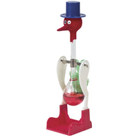 Drinking Bird Almost everyone remembers this hard to find toy with at least a twinge of nostalgia. Now, the Drinking Bird is back, disguised as a great demonstration of thermo dynamics. When the head of the bird is moistened with water it will repeatedly tip over and appear to be drinking from a cup placed in front of it. The dunking is due to the evaporating water, which cools the head reducing the pressure of the gas inside. The liquid inside the bird rises up from his tail towards his head, causing the bird to tip and appear to be drinking. As the bird dunks, the liquid returns to its tail, and the process begins again. In essence this is a small , cleverly designed thermodynamic engine which only needs water to runn! Size: 7 inches Age 8+