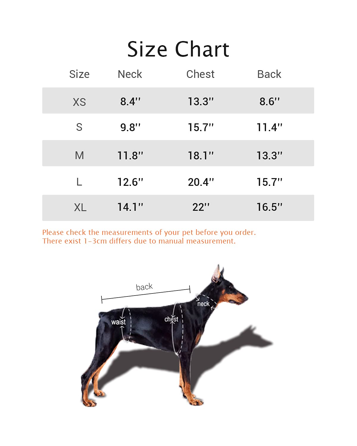 Suggestions: a. Measuring your dog for a perfect fit. Sizing should allow room for 2 fingers to fit between the item and the pet. b. If any of the measurements are 'between' two sizes, choose the larger size. c. Your baby usually wears size S doesn't mean all size S will fit him/her.
