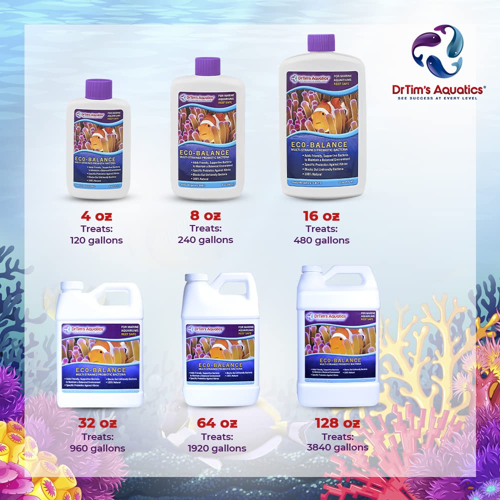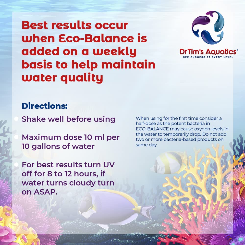 DrTims Aquatics Eco-Balance Probiotic Bacteria for Reef, Nano, Seahorse AquariaAchieve a healthy, thriving Reef, Nano, Seahorse aquarium with this Eco-Balance Probiotic Bacteria solution from DrTims Aquatics. Offering multi-strained probiotic bacteria for a healthy Reef, Nano, Seahorse aquarium, this powerful solution adds friendly, supportive bacteria to maintain a balanced, healthy and safe environment for fish and corals. While blocking out unfriendly bacteria, Eco-Balance promotes optimal water quality.The 100% natural Eco-Balance solution from DrTims Aquatics is H20 Pure and encourages beneficial bacteria to reduce the amount of bad bacteria in Reef, Nano, Seahorse aquariums and fish tanks. Eco-Balance is available in quantities of 4, 8, 16, 32, 64 and 128 ounces.Find all the pet supplies and aquarium resources you need at DrTims Aquatics. With formulas backed by scientific research and innovation, DrTims Aquatics products ensure that your fish and corals have a clean and safe environment.Features:- For Reef, Nano, Seahorse Tanks, Aquariums- Multi-Strained Probiotic- Promotes Optimal Water Quality- Blocks Out Unfriendly Bacteria- 100% NaturalPackage Includes:- 1 x DrTims Aquatics Eco-Balance Probiotic Bacteria for Reef, Nano, Seahorse Aquaria