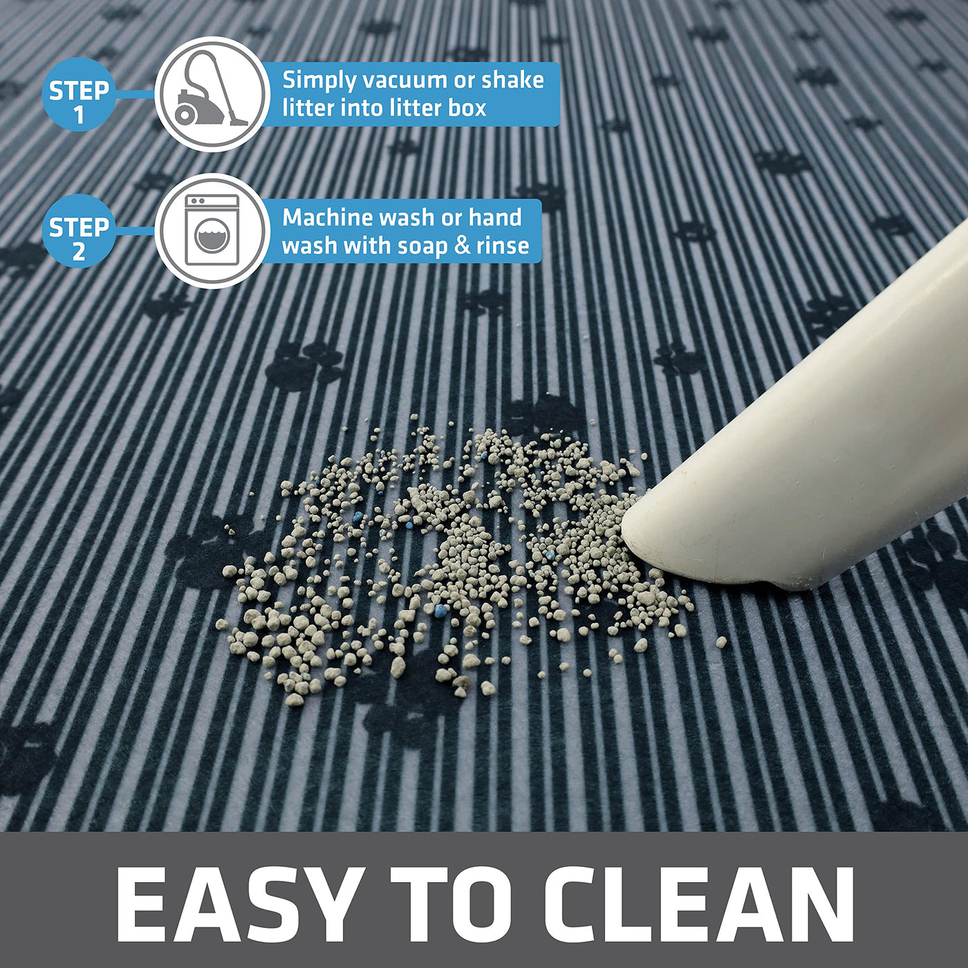 CONTAINS LITTER & MESS, REDUCES TRACKING (KEEPS FLOORS CLEAN): The Drymate Original Cat Litter Mat contains litter (both kicked out of the litter box and stuck to the cat’s paws). Our mat contains the mess and helps to keep your floors clean and dry. The soft paw-friendly material gently loosens litter from cat’s paws. | ABSORBENT POLYESTER FABRIC, WITH WATERPROOF BACKING (URINE-PROOF): Patented Drymate material absorbs and contains liquids and wicks away moisture. The waterproof backing stops liquids and urine from soaking through and prevents them from damaging or staining the surface below. | SLIP-RESISTANT BACKING: Helps to keep the mat securely in place and prevents it from sliding around. This keeps the mess on the mat, and not on your floors. Also, it makes it easier to vacuum because the mat stays in place. | EASY TO CLEAN (MACHINE WASHABLE): Simply vacuum or roll the mat up and pour excess litter back into the box. The mat can be machine washed or scrubbed with soap, hosed off and hung dry. Do not bleach. | (MADE IN THE USA) DURABLE & RECYCLED MATERIAL: Phthalate and BPA free. Polyester fabric is made from over 50% recycled fiber. Durable and long-lasting material.