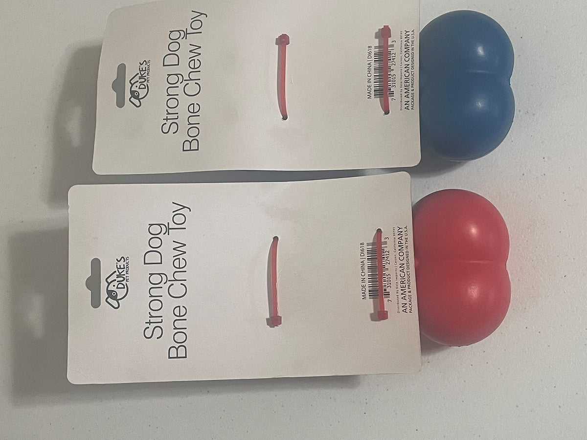 Q: What is the material of Duke's Strong Dog Bone Chew Toy?A: Duke's Strong Dog Bone Chew Toy is made of durable rubber, designed to withstand aggressive chewing while providing a safe play experience for your dog.