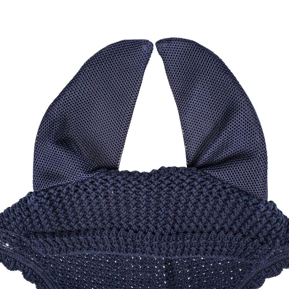 The Dura-Tech Quiet and Cool Ear Bonnet helps your horse focus under the saddle. This padded bonnet drowns out noise and eliminates the distraction of pesky bugs. The ears are constructed of a 250D mesh backing, allowing air to flow through, and a 3mm neoprene foam along the front ear canal, reducing noise. The fly veil is made from crocheted cotton yarn with scalloped edges and fine silver rope piping, offering an elegant look. It also has an extended crown piece designed to fit nicely under your bridle to hold the fly bonnet in place while riding. Available in black and navy.