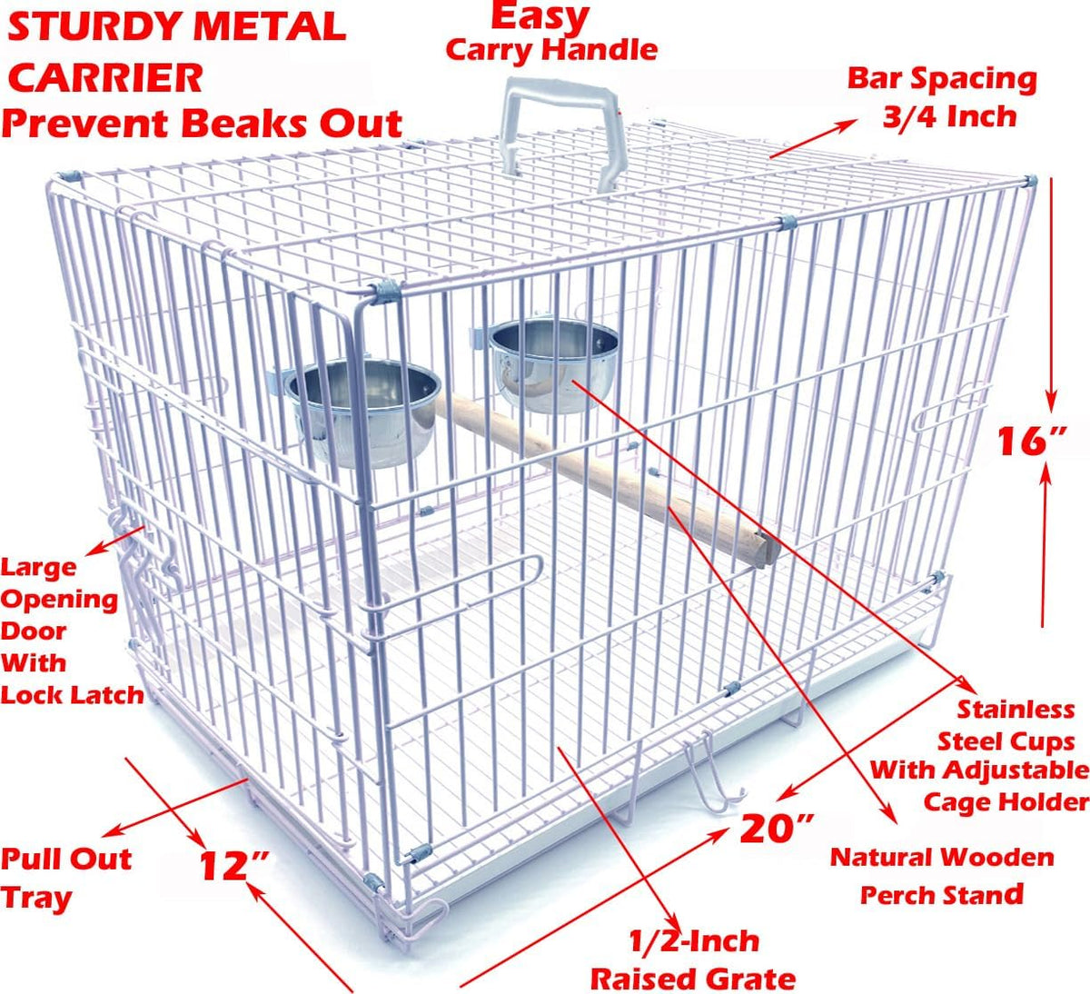 Durable Easy Portable Metal Travel or Veterinary Collapsable Parrot Bird Carrier Beaks Proof Cage with Stainless Steel Feeder Bo