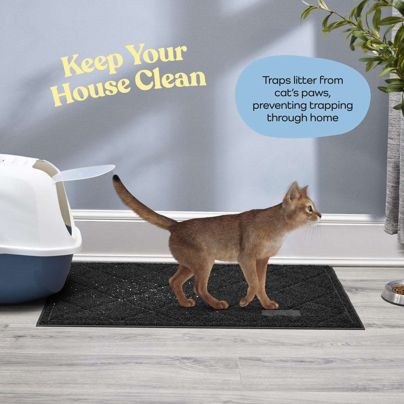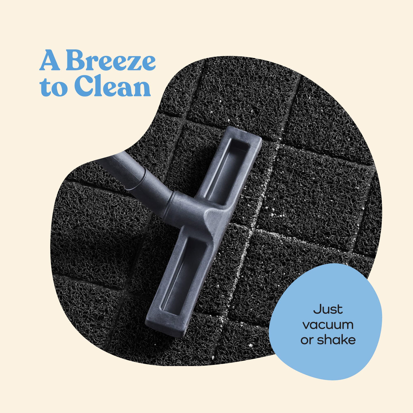 The new designed technologically advanced mat features deep grooves and superior mesh to capture the litter . Thoughtful design with elevated inner ridges & outer lip to Effectively contain pesky cat litter Just shake the dirty Cat Litter Mat, after vacuuming, use household cleaner and water to wash the surface, which can make this product look new, simple and effortless, clean and neat.