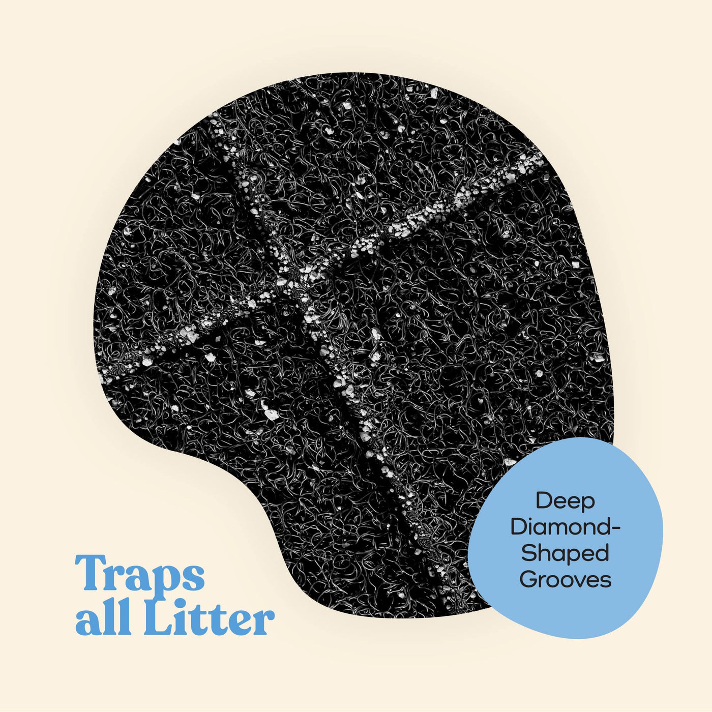 Q: How does the Durable Thick Cat Litter Mat trap litter?A: The mat features deep diamond-shaped grooves designed specifically to capture litter that clings to your cat's paws or spills out of the litter box. This prevents litter from scattering throughout your home and allows you to recycle any unused litter.