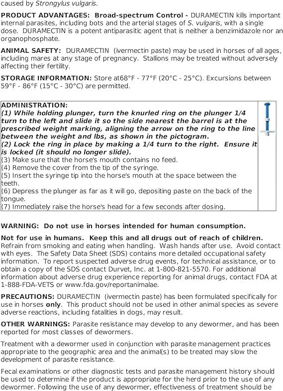 Product Description: The Duramectin Ivermectin Paste contains a potent concentration of 1.87% Ivermectin, which is proven to be safe and effective for horses of all ages. Whether you have young foals or mature stallions, this paste can be administered without the worry of adverse effects. It is particularly safe for pregnant mares and helps maintain the health and well-being of your horses during critical stages of their life.