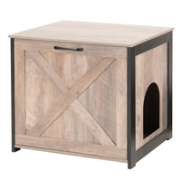 urniture style for more usage:The black frame and greige wood panel is designed to perfectly match the decor and in addition to being used as a litter box it can also be used as a side table next to a sofa a bedside table next to a bed or even a coffee table Quiet and hidden space: Are cats sensitive and easily stressed by nature Dont worry anymore this private space makes it feel safer reely placement come and go at Will : We have carefully designed a reversible entrance for the hidden litter box funiture The side panel with entrance can be on the left or right side to make you place it next to sofa bedside or other place convinently The side path (78 x 94 inches) is enough to get most cats in and out Easy to assmeble Easy to care:Following the instruction step by step to finish the installation quickly then your little furball will get a cat litter cabinet The veneered particleboard make you clean easily SIZE: External: 236 x 197 x 217 inches Interior Usable Dimensions: 217 x 183 inches please measure to fit your litter box