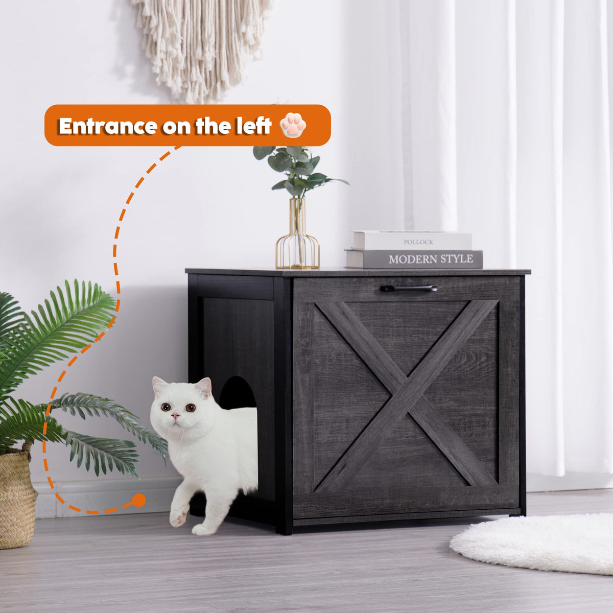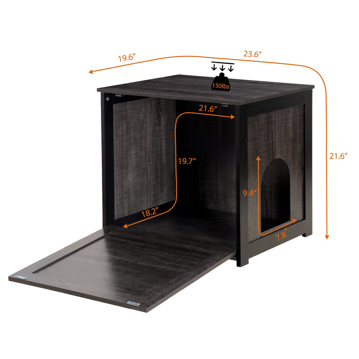urniture style for more usage:The black frame and dark grey wood panel is designed to perfectly match the decor and in addition to being used as a litter box it can also be used as a side table next to a sofa a bedside table next to a bed or even a coffee table Quiet and hidden space: Are cats sensitive and easily stressed by nature Dont worry anymore this private space makes it feel safer reely placement come and go at Will : We have carefully designed a reversible entrance for the hidden litter box funiture The side panel with entrance can be on the left or right side to make you place it next to sofa bedside or other place convinently The side path (78 x 94 inches) is enough to get most cats in and out Easy to assmeble Easy to care:Following the instruction step by step to finish the installation quickly then your little furball will get a cat litter cabinet The veneered particleboard make you clean easily SIZE: External: 236 x 197 x 217 inches Interior Usable Dimensions: 217 x 183 inches please measure to fit your litter box