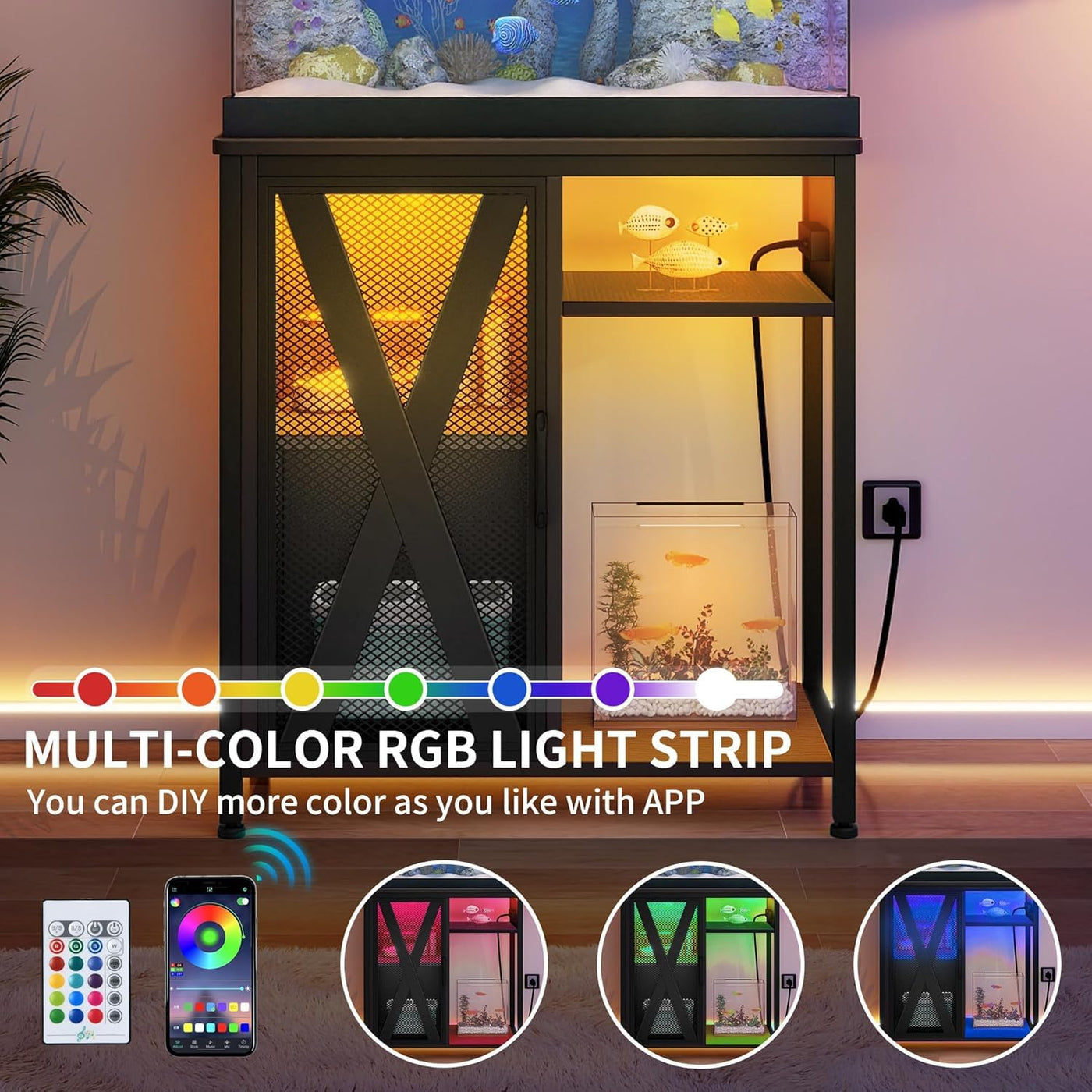 Gorgeous LED Lights: Our aquarium stand is equipped with LED lights featuring RGB capabilities, both on the cabinet and above the smaller fish tank stand. This allows you to adjust the lighting of your aquarium according to your mood, creating any desired illumination | Heavy-duty design: Maximize space efficiency with our stand. It can hold 75-120 gallon fish tank on top and 5 gallon aquarium on the bottom or fish tank kit. Suitable for most standard aquariums.Tanks not included | Orderly storage: This fish tank with stand easily keeps everything organized. The built-in cabinet stores fish food, cleaning tools, and other accessories while the adjustable shelves help accommodate items of various sizes | Convenient and practical: The integrated power outlets can be easily installed, without the need for additional tools. Easy to connect electronic devices such as lights, heaters, and oxygen pumps, simplifying your fish tank management | Sturdy & durable construction: Made of thickened table legs, our fish tank table supports up to 2000 lbs. The included anti-tip devices help avoid tip-over accidents. The moisture material ensures durability