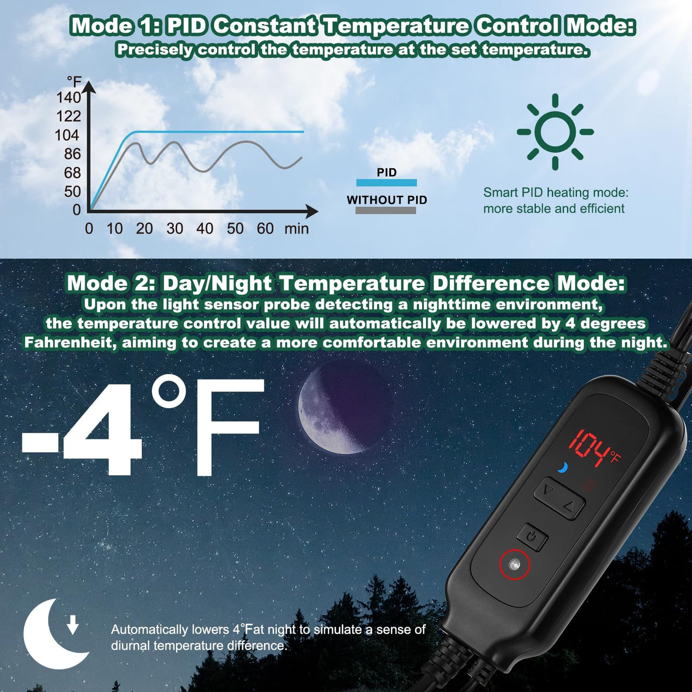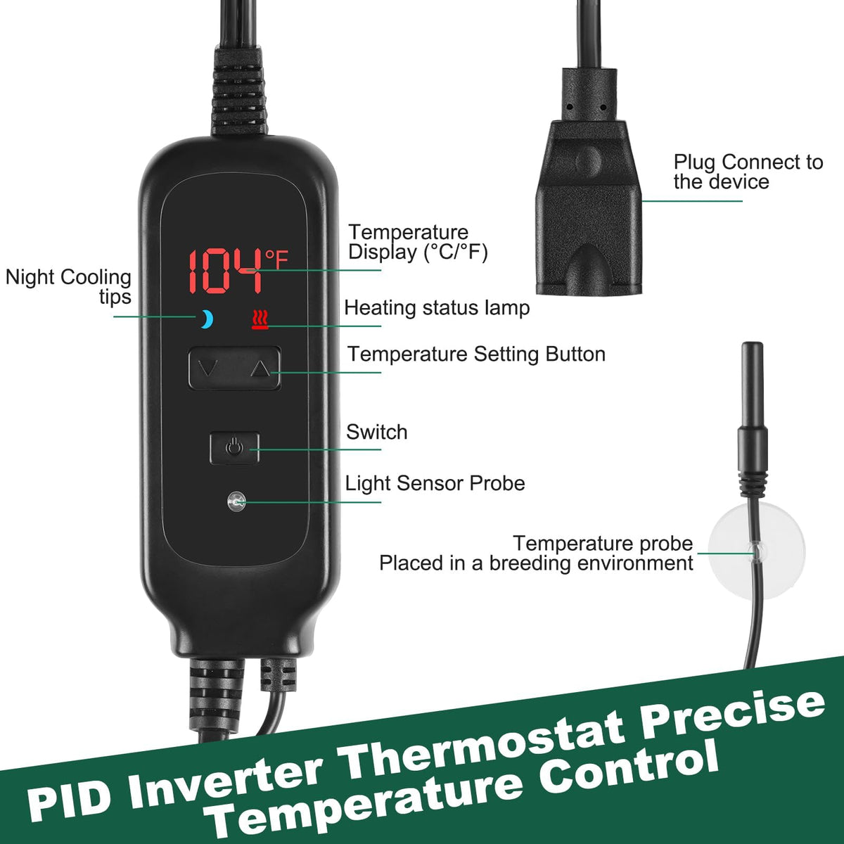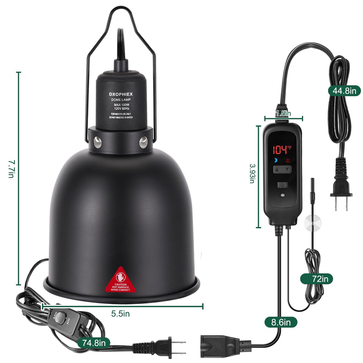 Dxophiex Deep Dome Reptile Light Fixture With Dimming Thermostat Integrates Illumination And Temperature Control,Combines Illumination And Heating In One, Utilizing The Intelligent Pid Heating Mode Combined With A Light-Sensitive Probe To Accurately Control The Temperature. It Ensures That The Heat Lamp For Lizard Always Maintains The Ideal Range Of 20C To 45C (68F To 113F).Supporting Free Switching Between Celsius And Fahrenheit Temperature Units, Temperature Management Becomes More Intuitive. The Bearded Dragon Light Fixture Is Etl Certified, Compatible With E26 Lamp Bases, And Can Handle Power Up To 100W. The Reptile Dome Light Fixture Is Made Of High-Quality Aluminum Alloy To Enhance Brightness And Heat Reflection, Boosting Uva/Uvb Light Source Output. Additionally, The High-Precision Digital Temperature Controller Monitors And Adjusts The Temperature In Real-Time, Making It Easy To Operate And Widely Suitable For Bearded Dragons, Lizards, Chicks,Turtles, Hermit Crabs, Frogs, Snakes, Leopard Geckos, Ball Pythons, And Other Reptiles And Amphibians.