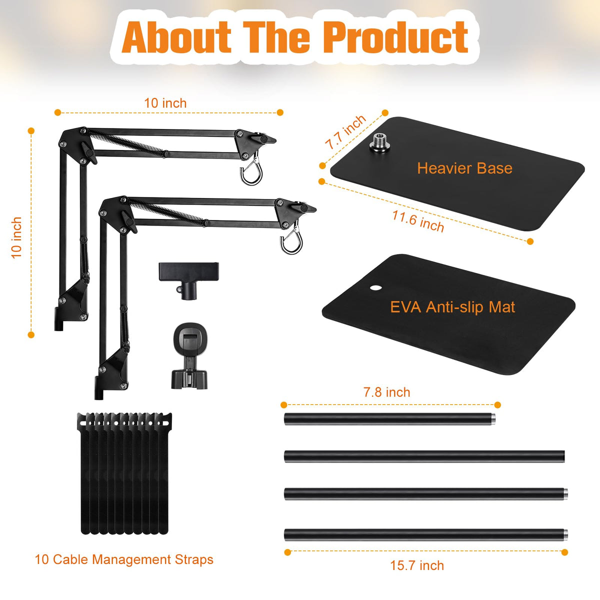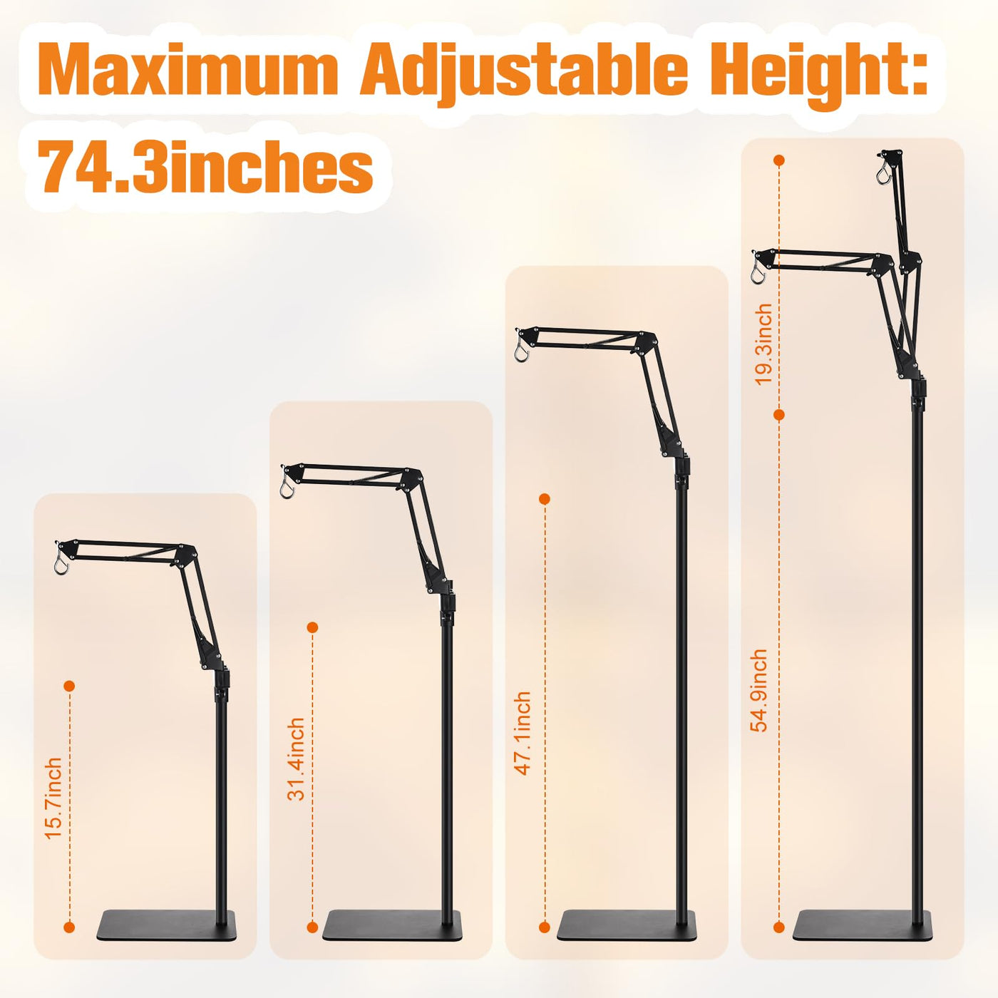 Our upgraded reptile lamp stand features flexible dual arms, allowing you to hang two light fixtures simultaneously to meet various needs. Each arm rotates 360 degrees and folds or stretches 180 degrees, providing full control over lighting angles and extension distances. The reptile light stand is adjustable to six different heights, from 15.7 to 74.3 inches, making it suitable for any terrarium height. You can use it on a tabletop or as a freestanding floor lamp, ensuring the perfect lighting and temperature for your pets or plants. Designed with thicker poles and a weighted, widened base, this heat lamp stand offers excellent load capacity and stability, supporting up to 3.5 pounds per arm without bending. For optimal stability, align the arm and base direction and place heavy objects on the base to prevent tipping. The lamp stand is also easy to set up and includes EVA non-slip pads at the bottom to prevent tipping and protect floors, as well as ten cable ties to keep cords tidy. Versatile in use, this lamp stand is perfect for reptiles like snakes, bearded dragons, lizards, and geckos, as well as for brooder lamps, swing arm floor lamps, grow lights, turtle tank lights, aquarium lights, and indoor floor or hanging plant stands.
