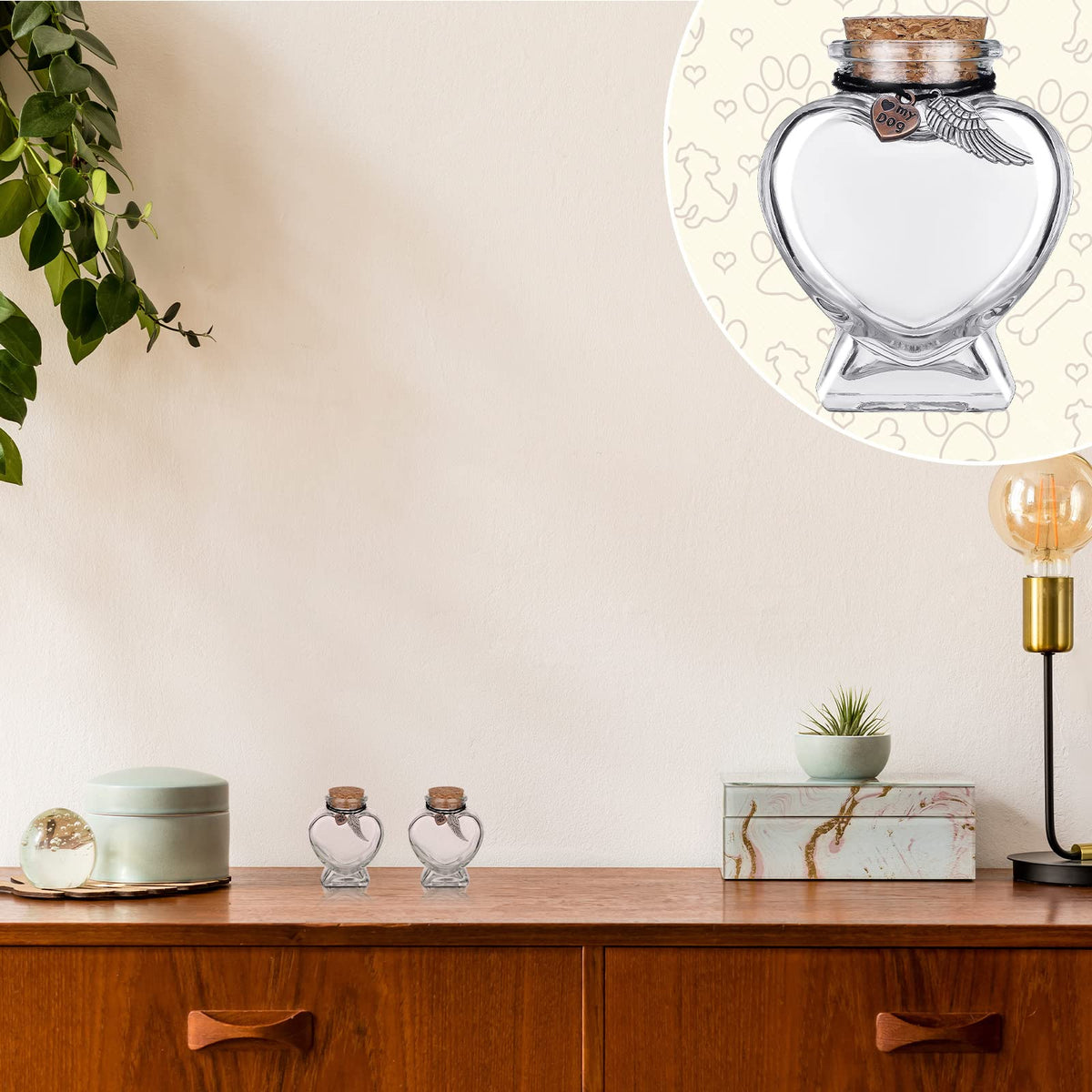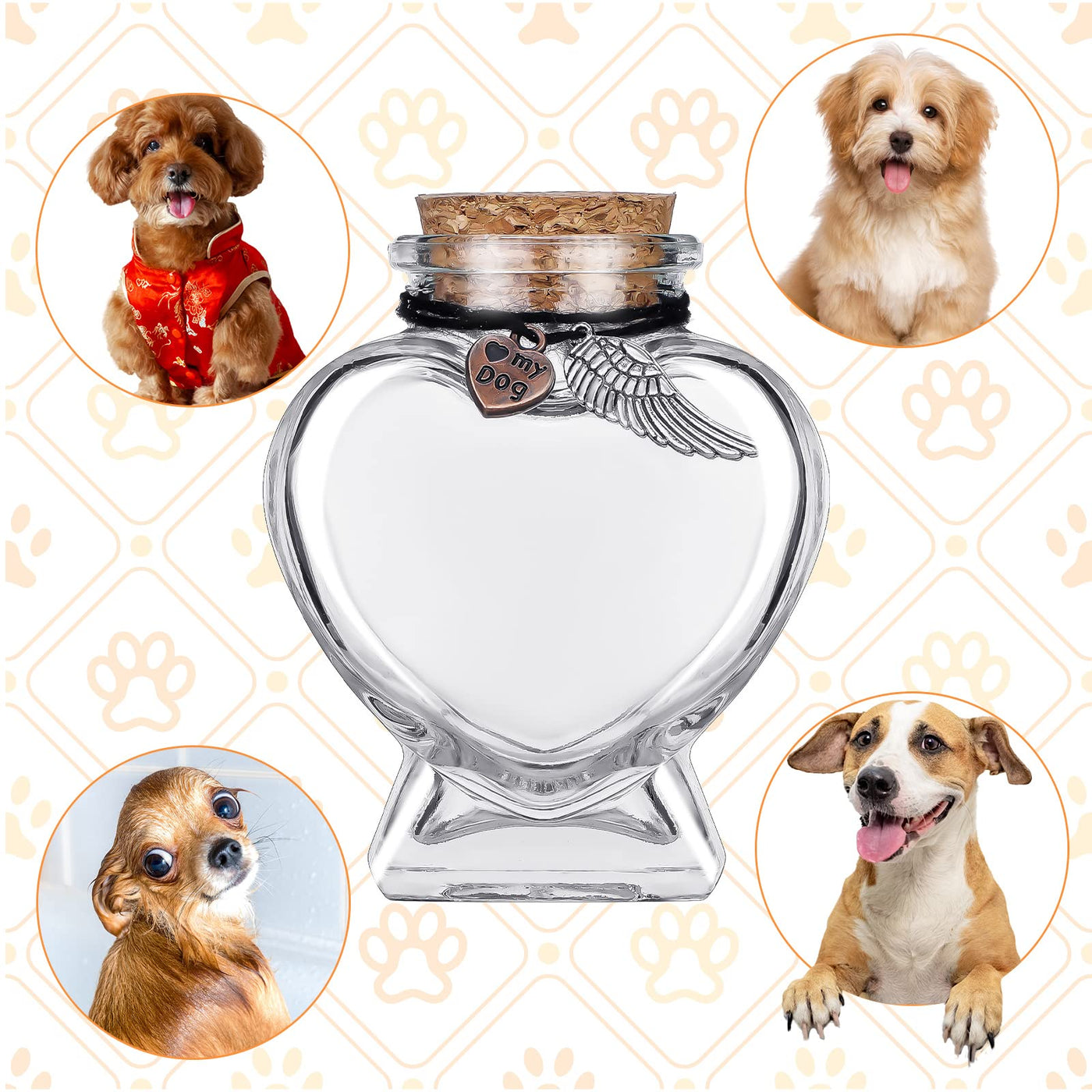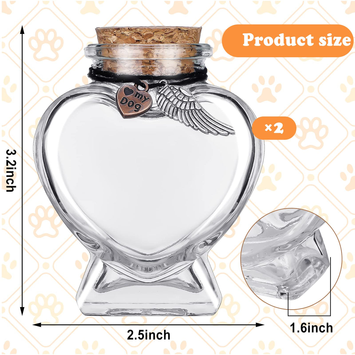 Features: You can use this small glass bottles with cork to contain dog's hairs, fur, ashes or other items of your lost dog. This glass bottle with cork stopper is small and lightweight, it is also a nice choice for you to contain other small gifts or crafts, and then display it on your tables. Specifications: Bottle color: transparent Bottle size: approx. 80 x 63 x 40 mm/ 3.15 x 2.48 x 1.57 inches Main material: Heart shape bottles: glass Wing pendants: stainless steel Heart shaped pendants: stainless steel Package includes: 2 x Heart shape bottles 2 x Wing pendants 2 x Heart shaped pendants Warm notes: Please allow slight deviation due to manual measurement. Please allow slight color differences due to different monitors.