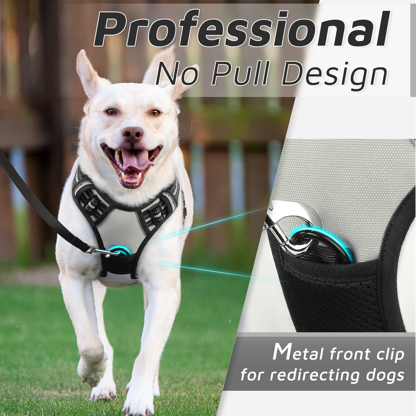 1. Thoughtful design reduces pulling pressure on your dog's neck and thus prevents choking or injuries when pulling. 2. Two leash attachment rings: One in the front for no-pull/no-choke feature while walking or training. The other one on the back for keeping your dog stay at home or yard. 3. Reflective straps allows safe at night or early morning walk.