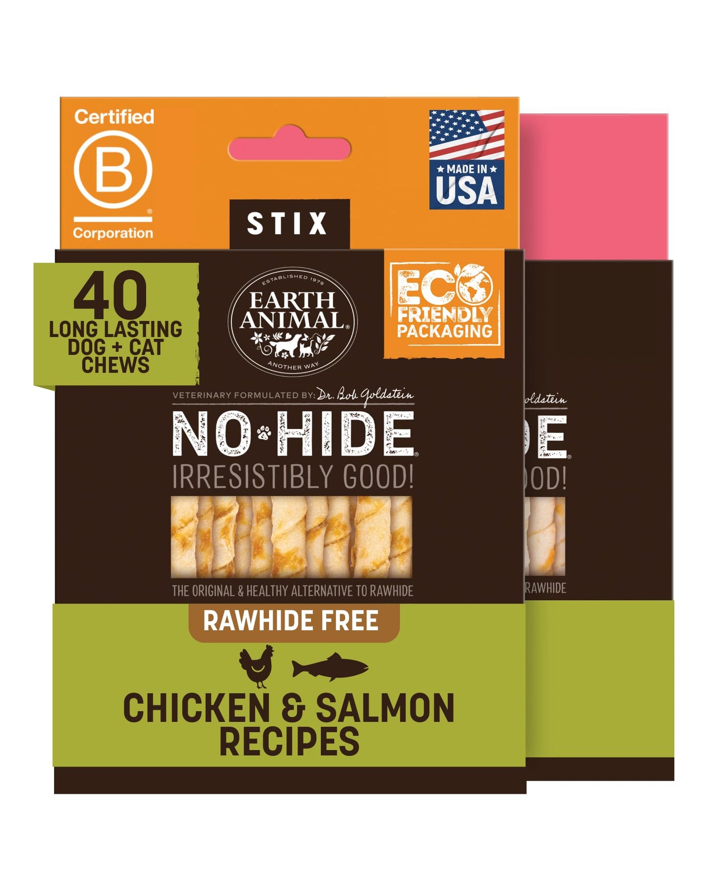 Earth Animal No Hide Stix - Long Lasting Rawhide Free Small Dog Chews Sticks, Chicken & Salmon Variety Bundle - 40 Count Value P