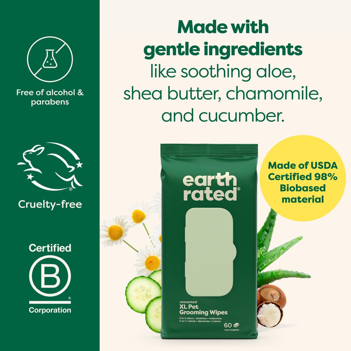 Our Best-Selling Dog Wipes Are Now Available In An Xl Size! Earth Rated Xl Pet Wipes Are The Ultimate Grooming Essential For Pet Parents. Designed To Handle 2X The Mess, These Extra-Large Wipes Are Perfect For Large Dogs Or Tackling Extra Messy Moments. Each Wipe Measures An Impressive 11 X 12 Inches (27 X 30 Cm), So You Often Only Need One To Get The Job Done. These 3-In-1 Grooming Wipes Clean, Deodorize, And Hydrate With A Gentle, Hypoallergenic Formula Made With Ingredients Like Shea Butter, Aloe Vera, And Chamomile. Free Of Alcohol And Parabens, They'Re Gentle Enough For Daily Use And Tough Enough To Remove Dirt, Mud, And More From Paws, Body, And Bum. With Their Thick, Textured Design, These Wipes Offer A Solid Clean