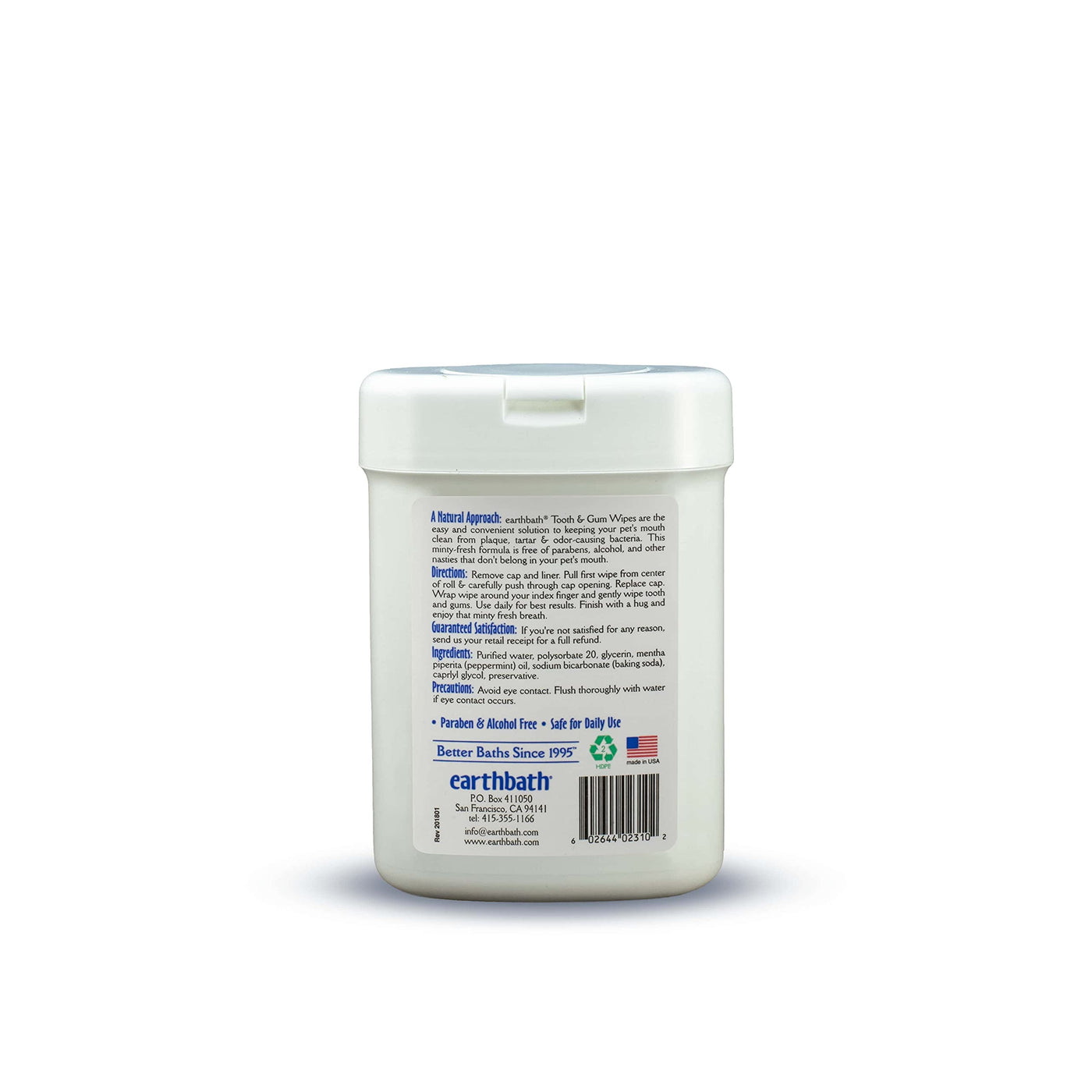Earthbath tooth & Gum wipes are the easy and convenient solution to keeping your pet's mouth clean from plaque tartar & odor-causing bacteria. This minty-fresh formula is free of parabens alcohol and other nasties that don't belong in your pet's mouth.