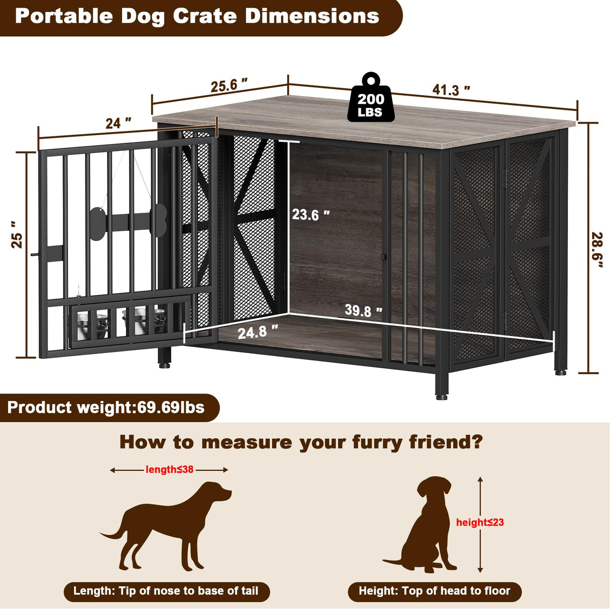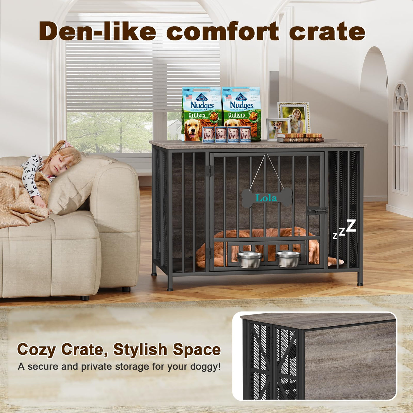 EasyCom Foldable Dog Crate Furniture, 41.3 Dog Crates for Medium/L arge Dogs, Wooden Dog Kennel Indoor with Tag & Adjustable Dog Bowls, Dog Cage Use as End Table/TV Stand, Oak Grey