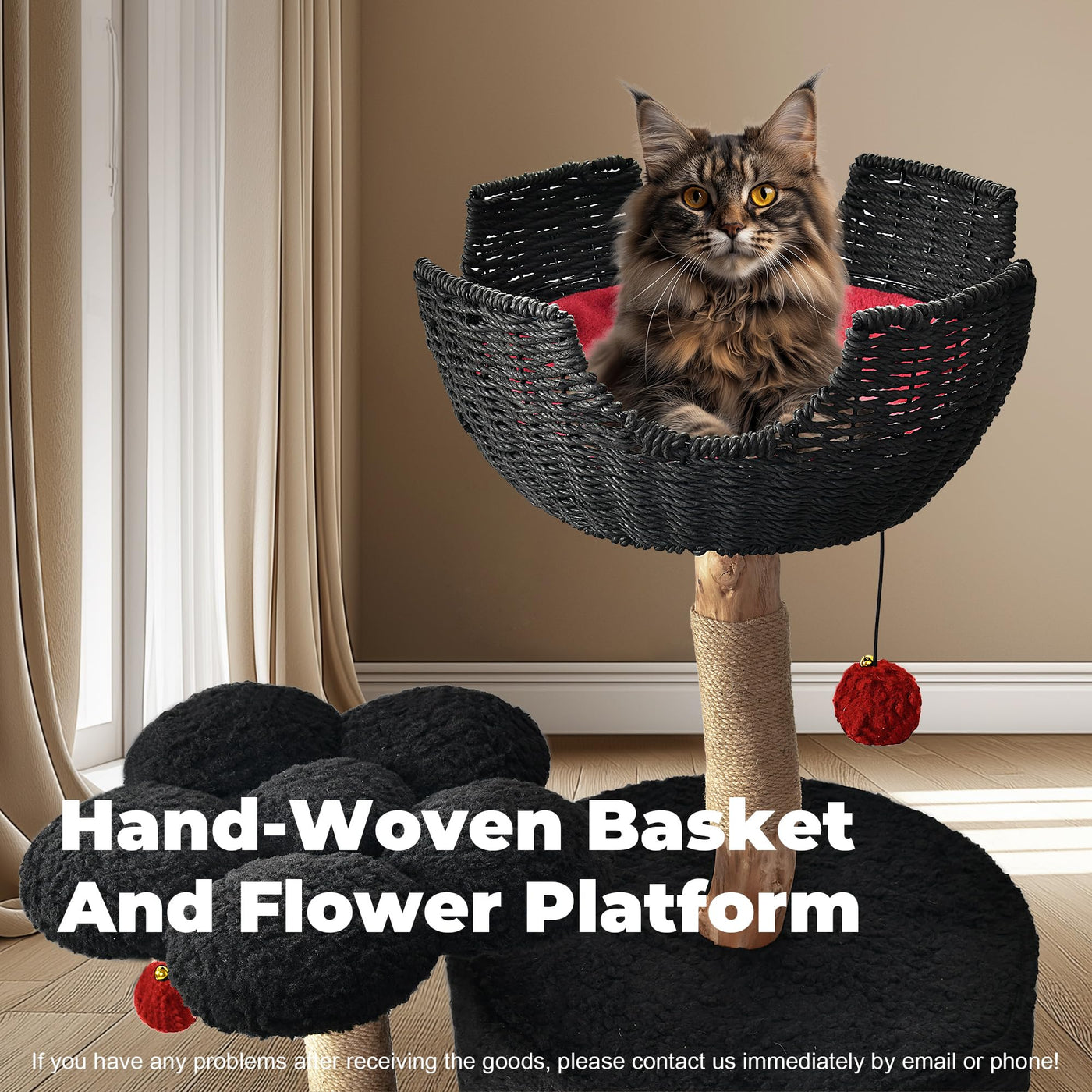 Easyego Modern Cat Tree for Indoor Cats,Solid Wood Cat Tree Tower with All-Season Mat,Hand-Woven Basket And Flower Platform & Cat Condo,Cute Aesthetic Cat Tree with Scratching Posts for Large Cats, (Modern Black)
