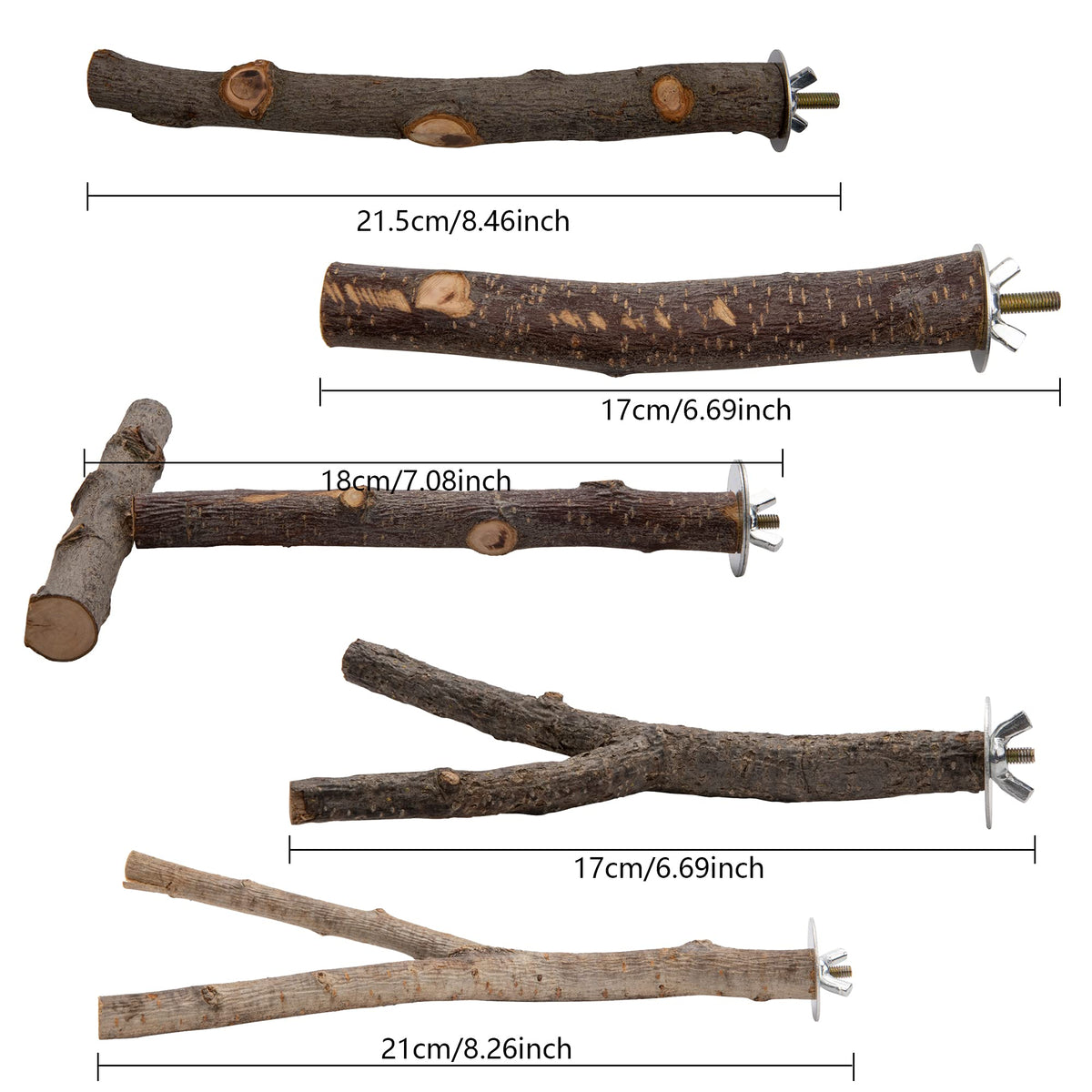 Q: What are the dimensions of the perches included in the set?A: The set includes two branch perches measuring approximately 6.69 and 8.26 inches, two wooden perches measuring 6.69 and 8.46 inches long, and one T-shaped perch measuring 7.08 inches tall.