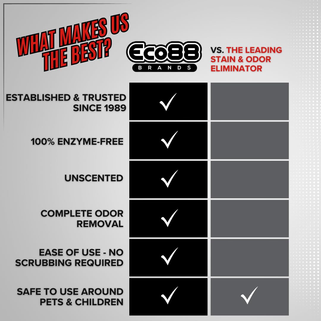 Q: What makes Eco-88 different from other pet odor removers?A: Unlike many other products that simply mask odors with fragrances or perfumes, Eco-88 permanently eliminates odors and stains. Its environmentally safe, biodegradable formula ensures effective cleaning without harmful chemicals.