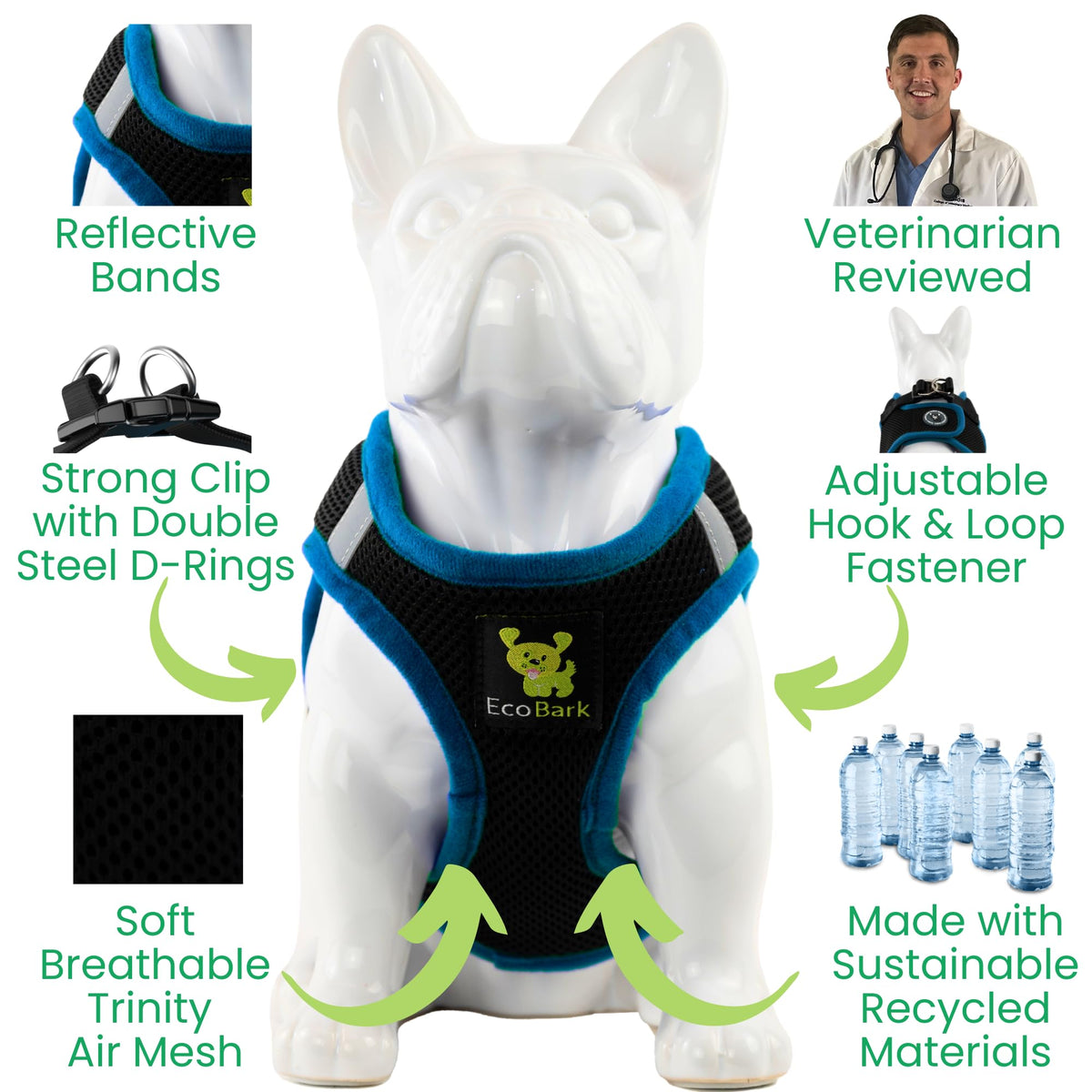Step-In Reflective Dog Harnesses help to Enhance Your Walking Experience! EcoBark's Eco-Friendly Dog Harness was created to uniquely fit those odd shaped dogs, it’s made from ROSH Tested, not toxic ultra-padded mesh and nature friendly strappings created from recycled water bottles. The Rapid Fastener Harness is a gentle soft vest harness that is available in 6 different colors and 5 sizes Easy Fastener technology hugs those ‘odd’ shaped dogs, allowing you to give your dog the perfect non slip fit! Ultra-Soft and Highly Durable Eco-Friendly high-quality Straps Made from Recycled Water Bottles ROSH Tested, Non-Toxic, Light-Weight Polyester Ultra Padded Mesh Comfort Webbing. Innovative No-Choke Design Protects Pet's Fragile Trachea and Throat with Extra Plush Piping Around the Neck Opening. Great for Walking, Running and Hiking. Breathable for all Outdoor Activities, Hugs the dog with a Flexible Air-Mesh which Maintains your Dog's Natural Movements in all weather conditions Adjustable Belt, Double Stitched around a Reinforced Anchor Hook, and Non-Breakaway Quick Release Clasps. The Rapid Fastener Harness Measurements: Important! Rapid Fastener Harnesses are a different and a more innovative design, so please do not base sizing off of other companies sizing. Animals come in all shapes and sizes. Therefore, please measure using a standard measure tape to get the best fit. Sizes below can be different depending on dog breed XX-Small: 3.5-5 lbs Base of Neck- 7.25 in Chest Girth: 9.25-10.25 in X-Small: 6-8 lbs Base of Neck-11.5 in Chest Girth: 11.5-12 in Small: 9-12 lbs Base of Neck- 12.5 in Chest Girth: 13.75-15.5 in Medium: 13-17 lbs Base of Neck- 15.5 in Chest Girth: 17.0-18.0 in Large: 18-27 lbs Base of Neck- 18.5 in Chest Girth:22.5-23.25. We incorporate Eco-Friendly Materials to help reduce the environmental footprint on the planet. We want to ensure a better future for our next generation of pet lovers and furry friends.