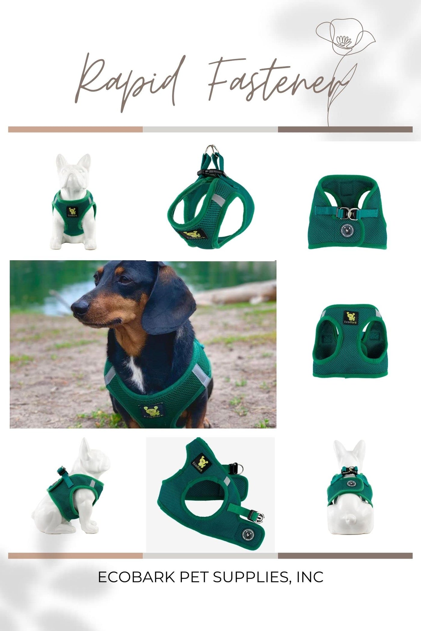 Step-In Reflective Dog Harnesses help to Enhance Your Walking Experience! EcoBark's Eco-Friendly Dog Harness was created to uniquely fit those odd shaped dogs, it’s made from ROSH Tested, not toxic ultra-padded mesh and nature friendly strappings created from recycled water bottles. The Rapid Fastener Harness is a gentle soft vest harness that is available in 6 different colors and 5 sizes Easy Fastener technology hugs those ‘odd’ shaped dogs, allowing you to give your dog the perfect non slip fit! Ultra-Soft and Highly Durable Eco-Friendly high-quality Straps Made from Recycled Water Bottles ROSH Tested, Non-Toxic, Light-Weight Polyester Ultra Padded Mesh Comfort Webbing. Innovative No-Choke Design Protects Pet's Fragile Trachea and Throat with Extra Plush Piping Around the Neck Opening. Great for Walking, Running and Hiking. Breathable for all Outdoor Activities, Hugs the dog with a Flexible Air-Mesh which Maintains your Dog's Natural Movements in all weather conditions Adjustable Belt, Double Stitched around a Reinforced Anchor Hook, and Non-Breakaway Quick Release Clasps. The Rapid Fastener Harness Measurements: Important! Rapid Fastener Harnesses are a different and a more innovative design, so please do not base sizing off of other companies sizing. Animals come in all shapes and sizes. Therefore, please measure using a standard measure tape to get the best fit. Sizes below can be different depending on dog breed XX-Small: 3.5-5 lbs Base of Neck- 7.25 in Chest Girth: 9.25-10.25 in X-Small: 6-8 lbs Base of Neck-11.5 in Chest Girth: 11.5-12 in Small: 9-12 lbs Base of Neck- 12.5 in Chest Girth: 13.75-15.5 in Medium: 13-17 lbs Base of Neck- 15.5 in Chest Girth: 17.0-18.0 in Large: 18-27 lbs Base of Neck- 18.5 in Chest Girth:22.5-23.25. We incorporate Eco-Friendly Materials to help reduce the environmental footprint on the planet. We want to ensure a better future for our next generation of pet lovers and furry friends.