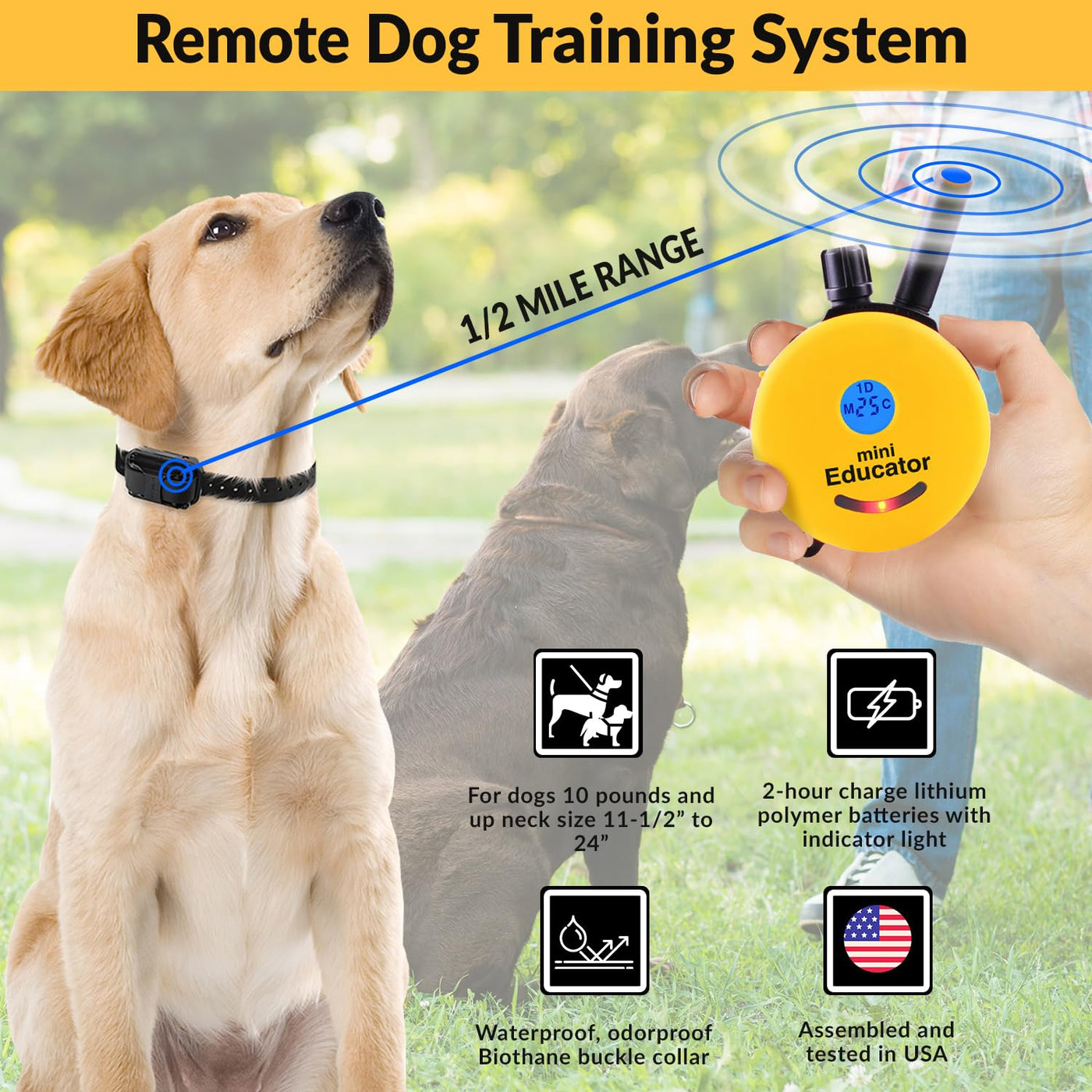 Educator E-Collar Humane Dog Training Collar With Remote, 100 Safe Tapping Stimulation Levels, Night Light, Waterproof, Rechargeable, 1/2 Mile 1 Small-Medium Dog, Yellow