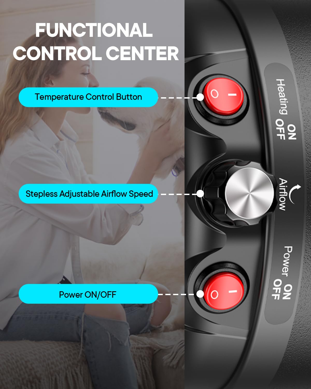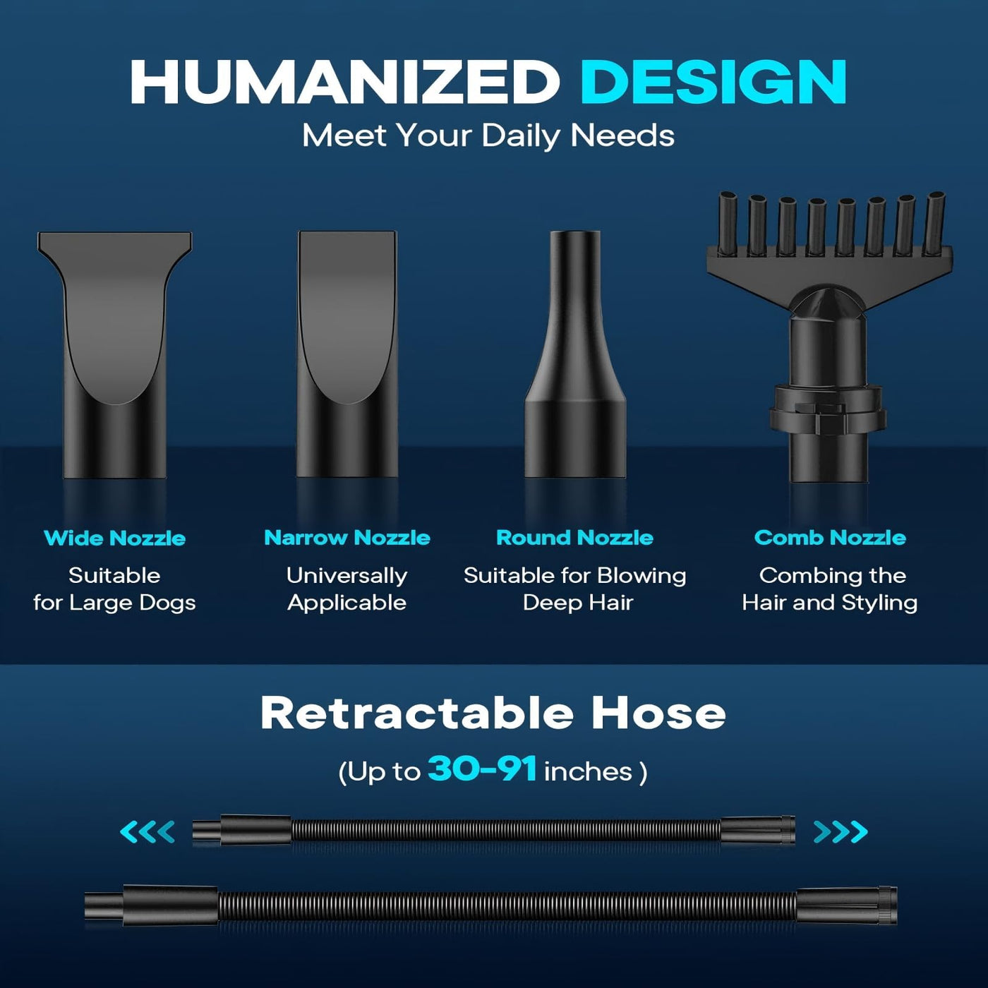 FOUR NOZZLES: Our dog hair dryer comes with 4 multi-functional nozzles tailored to meet your different pet grooming needs. Whether you need to blow out a deep undercoat, quickly dry your pets after a bath, or style and groom them, you can easily do it at home and save money.