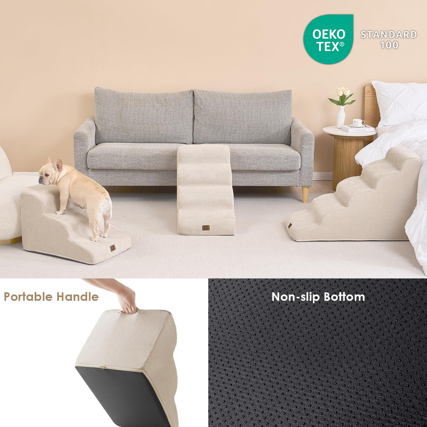 Eheyciga Curved Dog Stairs Ramp For High Beds 19.7' H, 4-Step Dog Steps For Small Dogs And Cats, Pet Stairs For High Bed Climbing, Non-Slip Balanced Pet Step Indoor, Beige