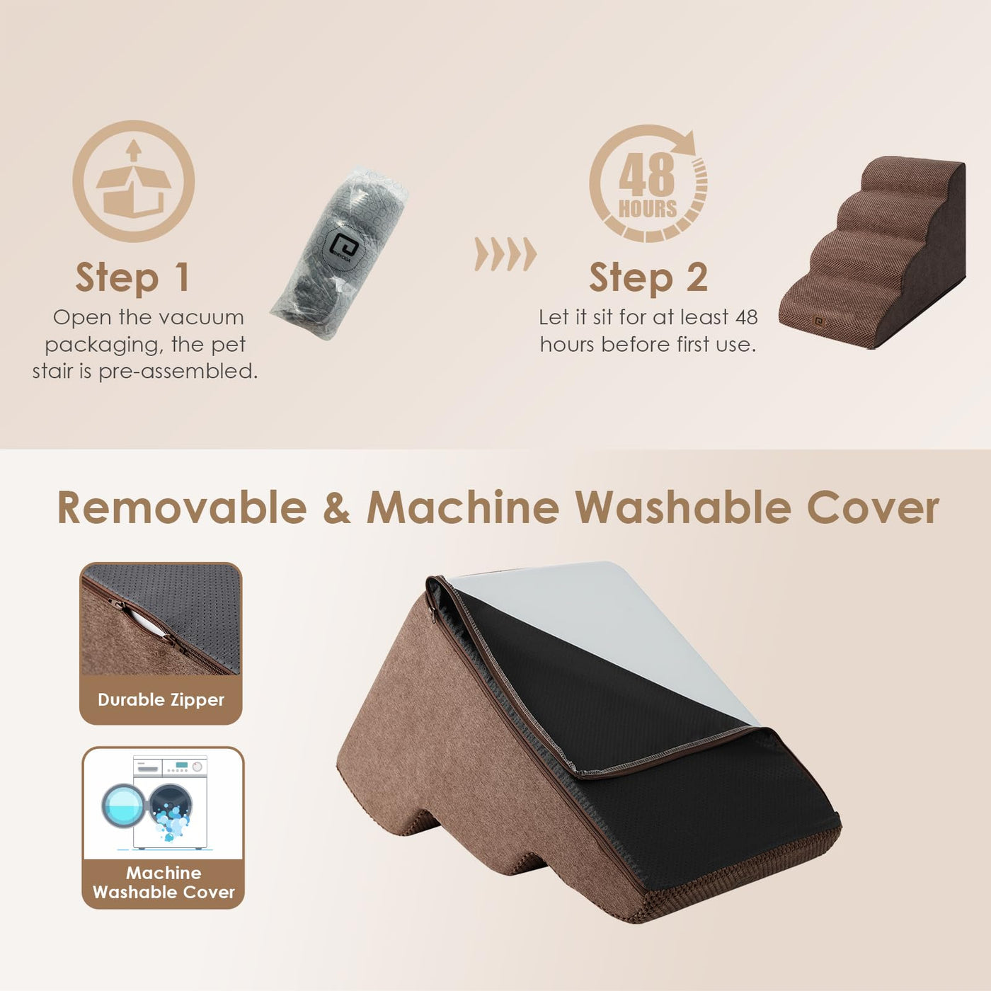 Q: How do I clean the EHEYCIGA foam dog stairs?A: The EHEYCIGA foam dog stairs feature a removable and washable cover made from bonded fleece. You can easily clean it by either hand washing or machine washing, making maintenance simple and convenient for pet owners.