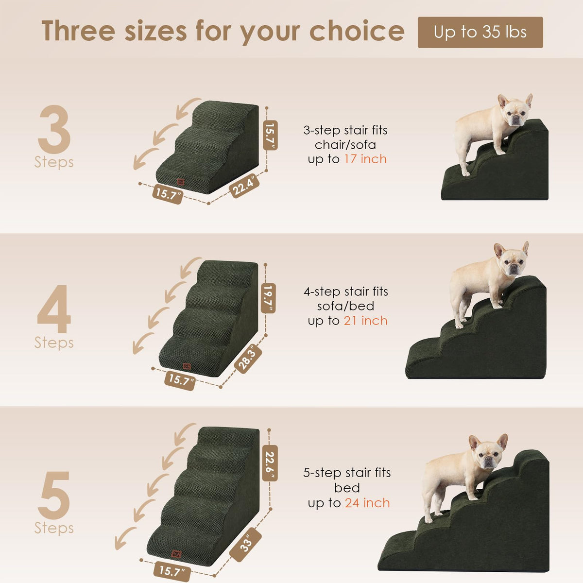 Q: What sizes of dog stairs are available for different bed heights?A: The EHEYCIGA foam dog stairs come in multiple step sizes to accommodate various bed heights: 2-step stairs fit beds up to 13 inches, 3-step stairs fit up to 17 inches, 4-step stairs fit up to 21 inches, and 5-step stairs fit beds up to 24 inches.