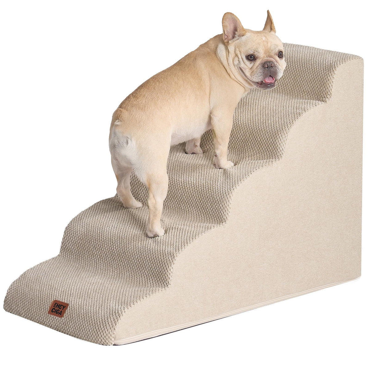Eheyciga Curved Dog Stairs Ramp For High Beds 22.6' H, 5-Step Dog Steps For Small Dogs And Cats, Pet Stairs For High Bed Climbing, Non-Slip Balanced Pet Step Indoor, Beige
