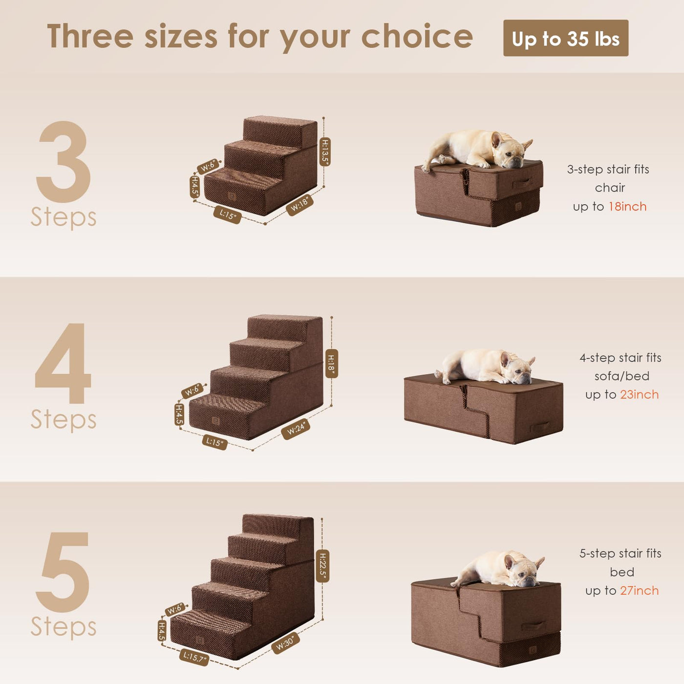 Q: What sizes of dog stairs are available for my pet?A: The EHEYCIGA Dog Stairs are available in three sizes: 3-step, 4-step, and 5-step options. The 3-step model is ideal for sofas and low beds up to 18 inches high, the 4-step version is suitable for medium height beds up to 23 inches, and the 5-step option is designed for higher beds up to 27 inches.