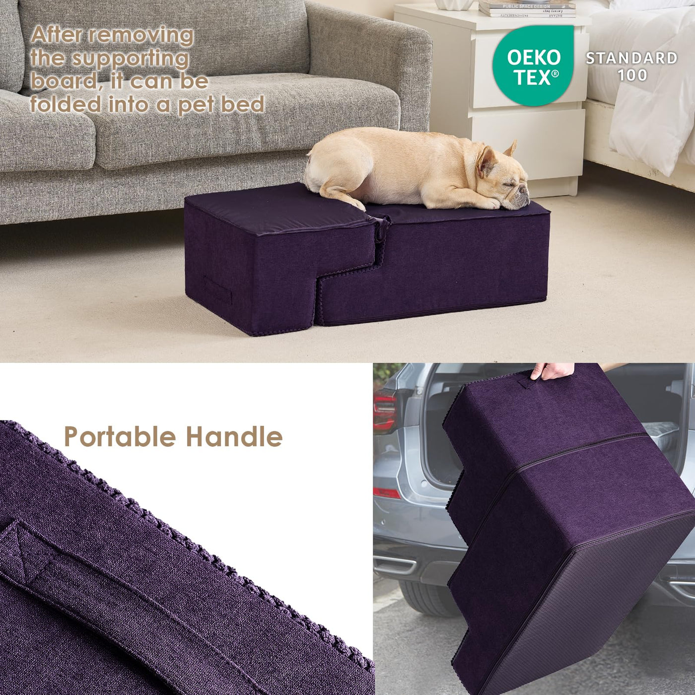 Q: Is the foam used in the dog stairs safe for pets?A: Yes, the EHEYCIGA Dog Stairs are made from 30D high density foam and an eco-friendly PP hollow sheet, ensuring stability and safety for your pets while they climb up and down.