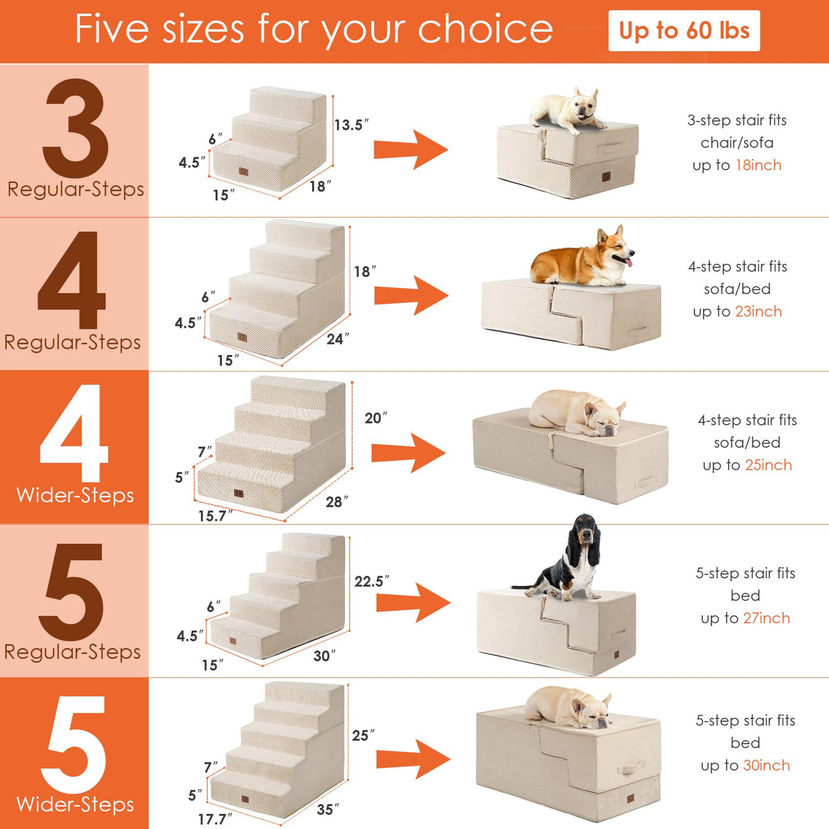Q: What sizes of dog stairs are available?A: The EHEYCIGA Dog Stairs come in three different sizes: 3-step, 4-step, and 5-step options. The 3-step version is perfect for sofas and low beds up to 18 inches high, the 4-step is suitable for medium-height beds up to 23 inches, and the 5-step is designed for higher beds that are up to 27 inches.