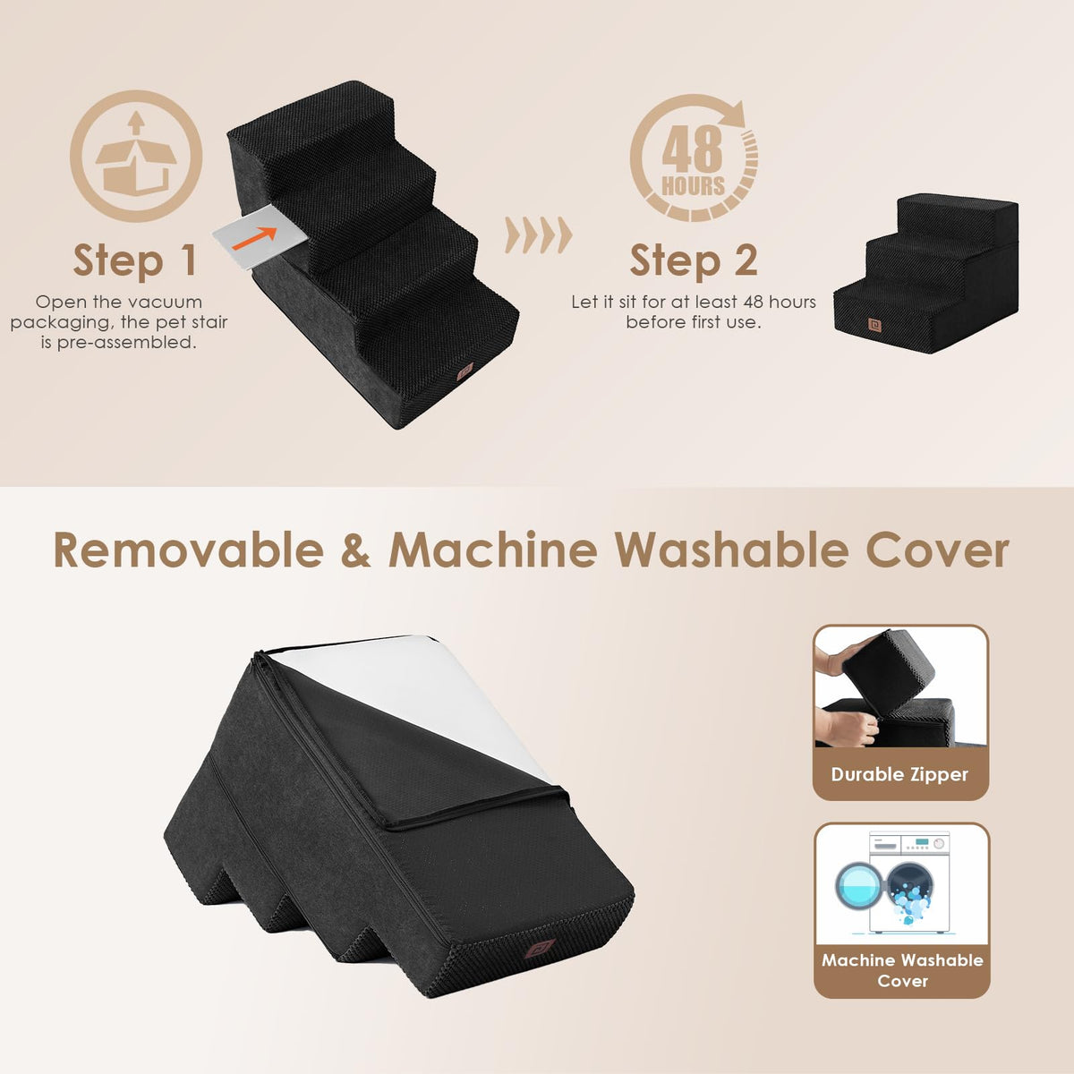 Q: How do I clean the EHEYCIGA Dog Stairs?A: The dog stairs feature a removable and washable cover, making cleaning easy. You can wash the cover by hand or place it in the washing machine for convenience.