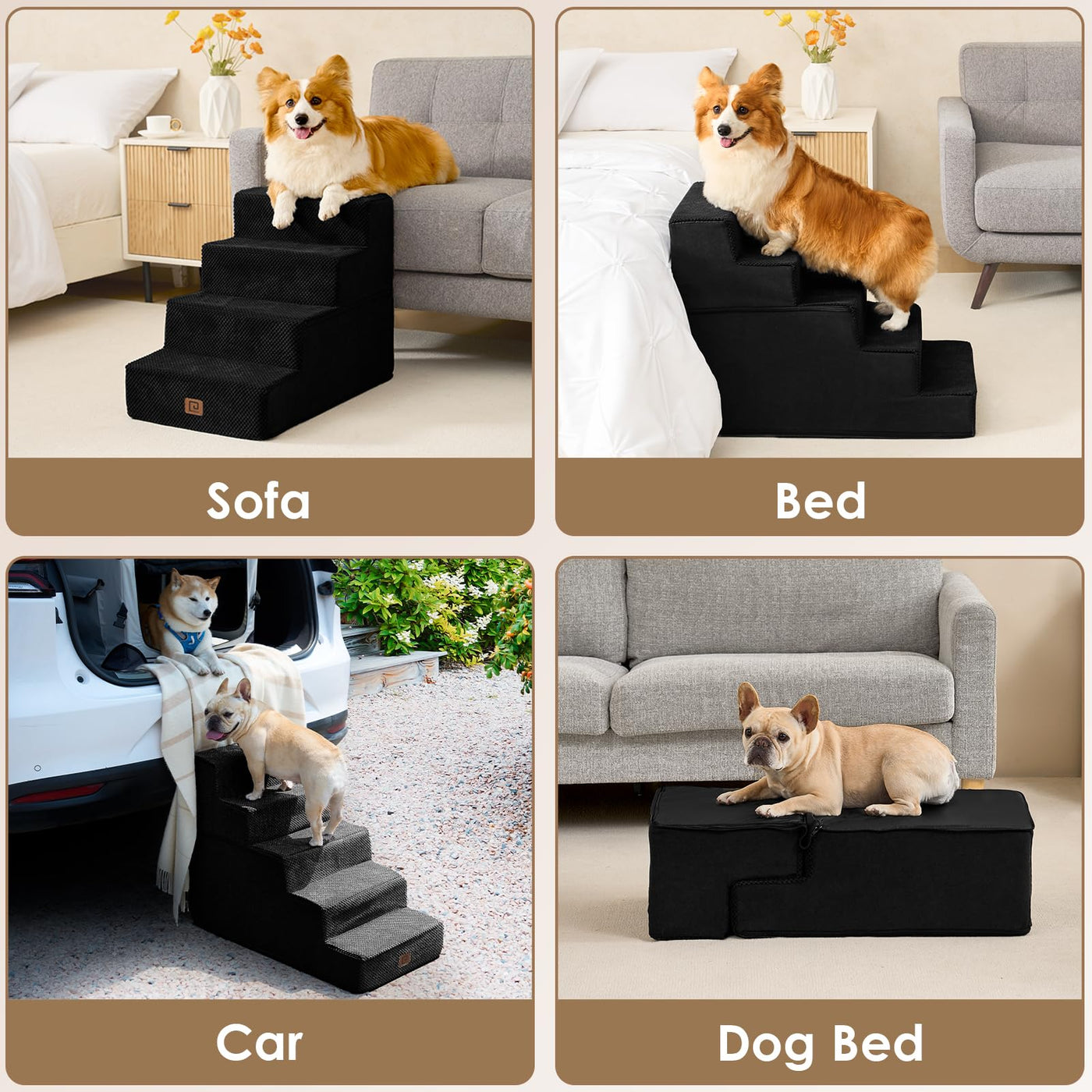 Q: What sizes are available for the EHEYCIGA Dog Stairs?A: The EHEYCIGA Dog Stairs are available in three sizes: 3-step, 4-step, and 5-step. The 3-step option is ideal for sofas and low beds up to 18 inches high, the 4-step option is suitable for medium-height beds up to 23 inches, and the 5-step version is perfect for higher beds up to 27 inches.