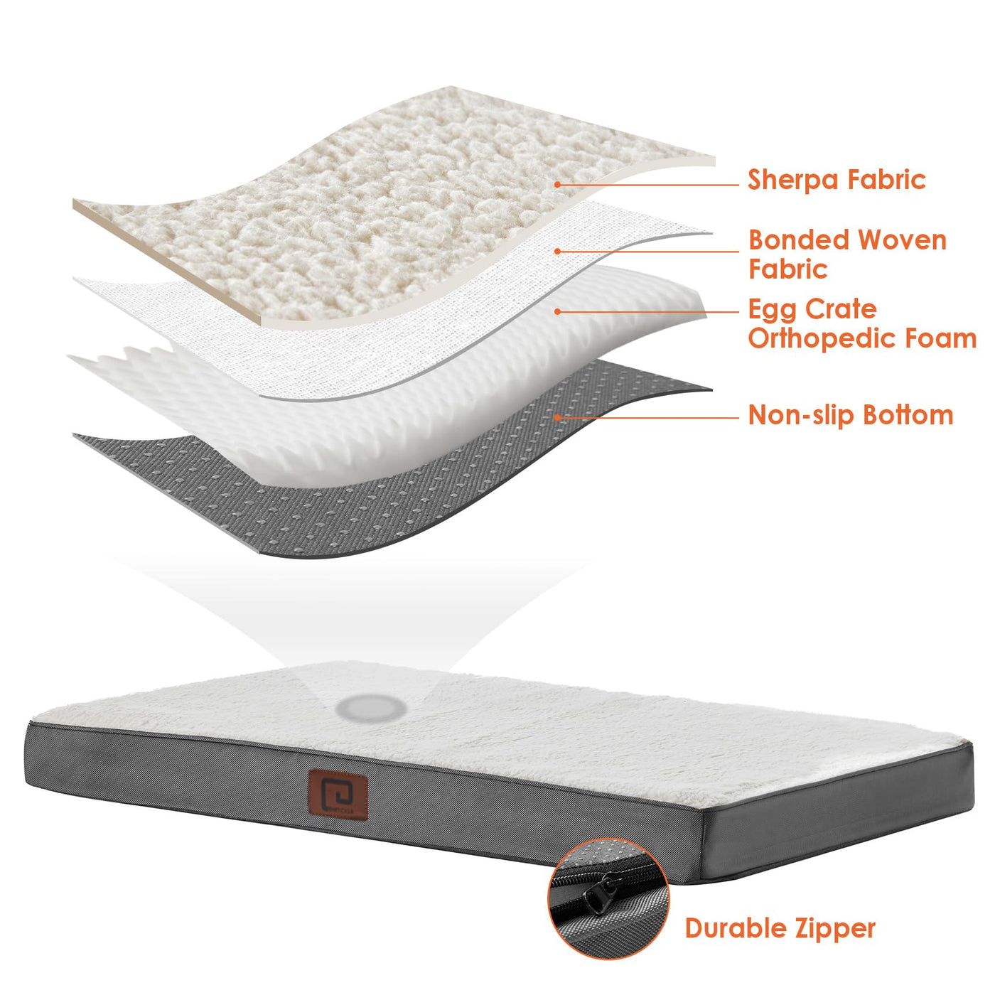 Q: What materials are used in the construction of the dog bed?A: The EHEYCIGA Orthopedic Dog Bed is made from high-density egg-crate foam for support and comfort, with a plush sherpa top for ultimate softness. The outer cover is made from durable polyester.