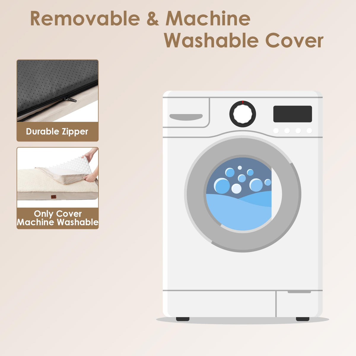 Q: Is the cover of the dog bed washable?A: Yes, the EHEYCIGA dog bed features a zippered removable cover that is machine washable. Simply unzip the cover and toss it in the washing machine for easy cleaning. However, please note that the inner foam is not washable.