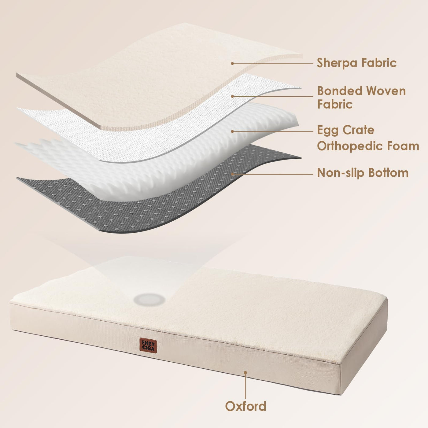 Q: What type of material is used in the dog bed?A: The EHEYCIGA dog bed is made from high-quality polyester, providing durability and comfort. It is constructed with a 3.5-inch high-density egg foam that offers excellent support for your dog's joints and muscles.