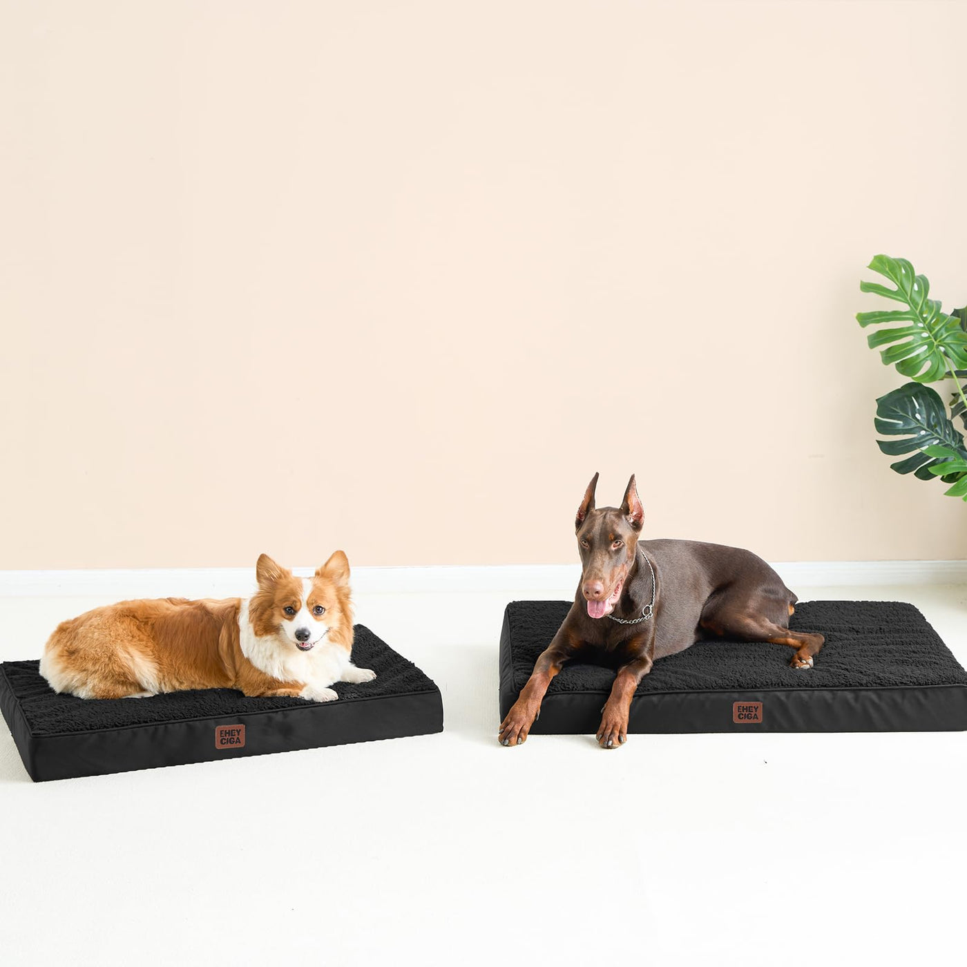 Q: What materials are used in the EHEYCIGA Dog Bed?A: The dog bed is constructed with a plush sherpa top for softness and a durable polyester material. The inner foam is made from high-density foam, providing sturdy support and comfort for your pet.